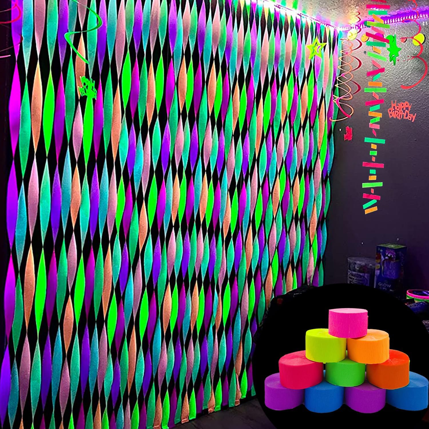 - 【All OCCASIONS 】Our luminous Crepe Paper Streamers perfect for blacklight dark glow party decorations, they will glow in the black light,birthday party,anniversary,festival celebrations, blacklight party.which is very suitable for your neon theme or luminous birthday party.
