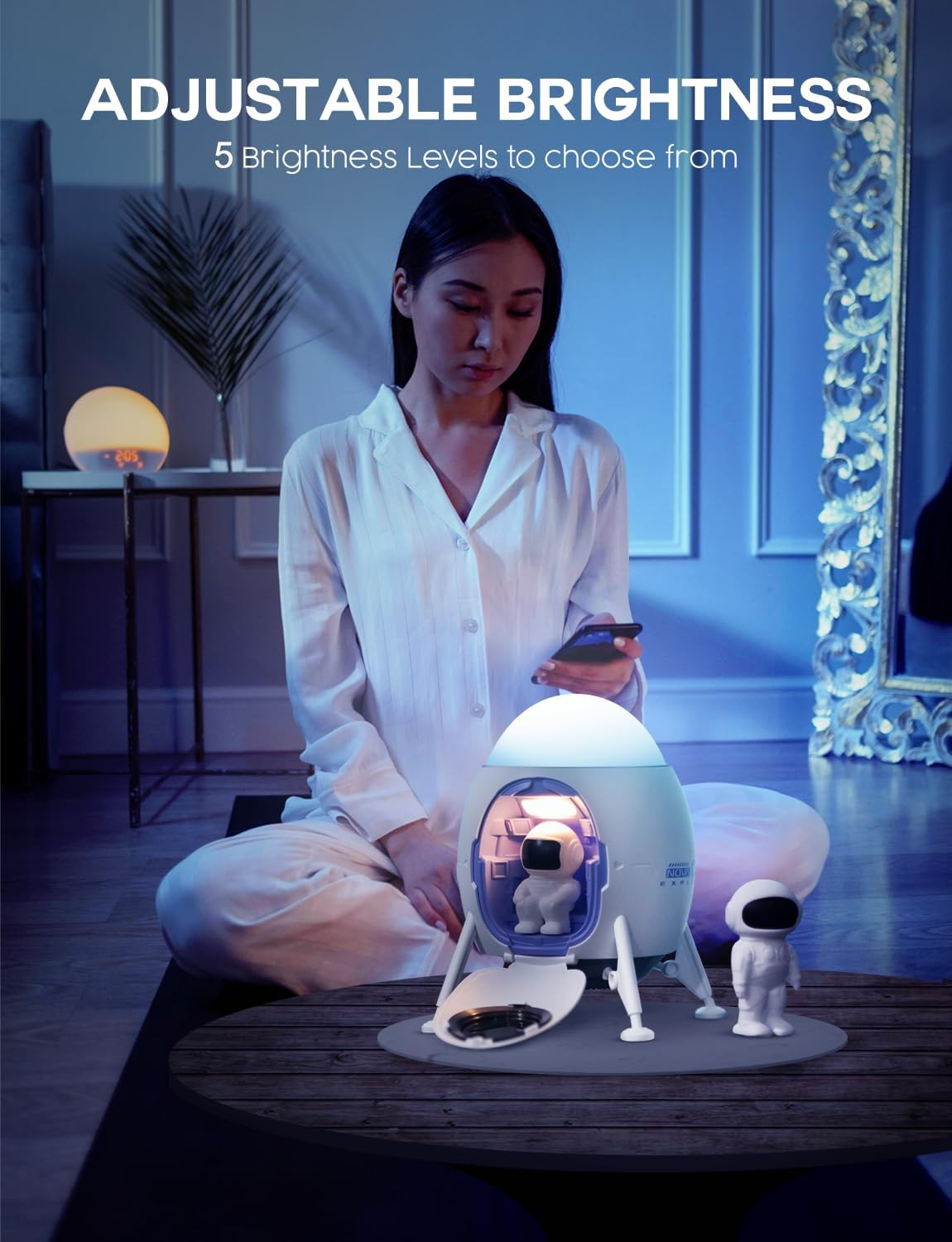 - Astronaut Projector: An exceptional piece of room decor, this astronaut-themed projector brings a touch of the cosmos into your space. The lamp features intricately designed spacecraft and astronaut figures, showcasing both a sitting and a standing astronaut. It is enhanced with a silicone moon pad that not only adds striking visual appeal but also creates a realistic ambiance.