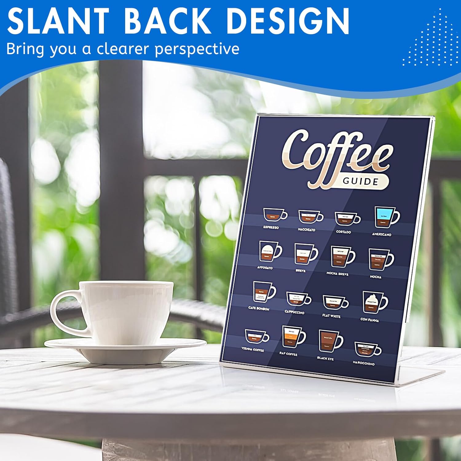 - Slant Back Design: The acrylic sign holders are designed with a slant back and tilts at a perfect angle to display the information on the paper, whether it's a guideline message or a dish. The bottom of the 5x7 acrylic sign holder is supported by an anti-tilt base for stability. Note: In order to ensure that you receive the most perfect plastic frames, we have attached a protective film on the surface of each acrylic paper stand, please remove the film before use