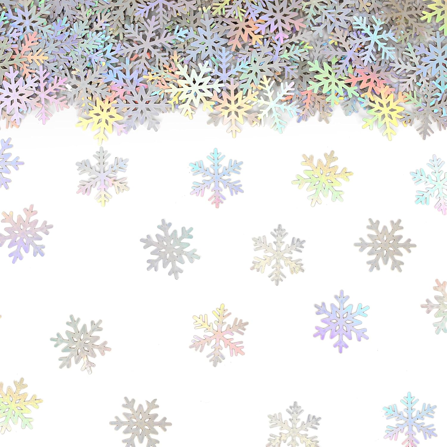 - Premium quality,proper size and charming color.The small snowflakes for crafts are made from premium paper card and well cut,the color is super amazing,looks like silver,but also like rainbow color changing because of the light.The christmas snowflake confetti size is 1.2inch,perfect for holiday crafts,recommend as table decorations or craft supply.