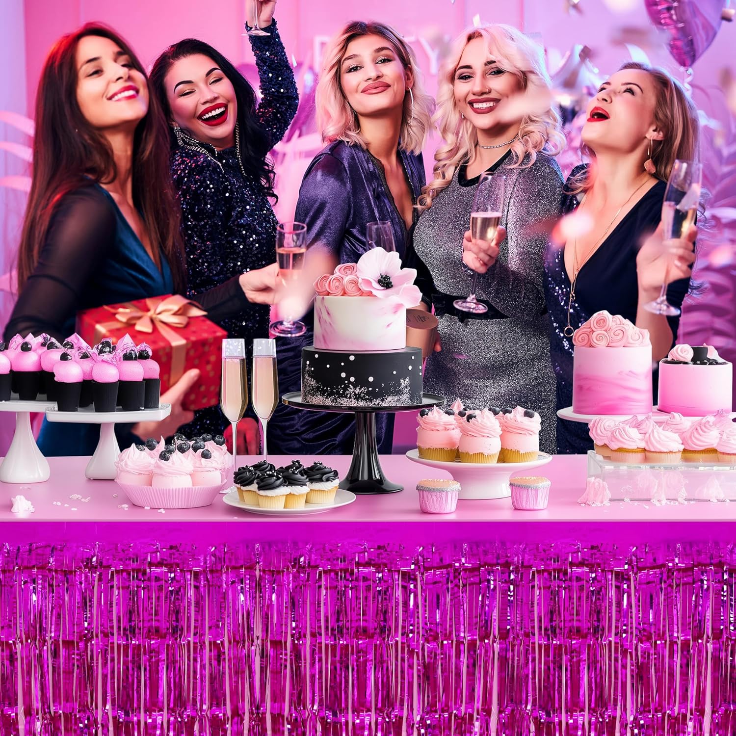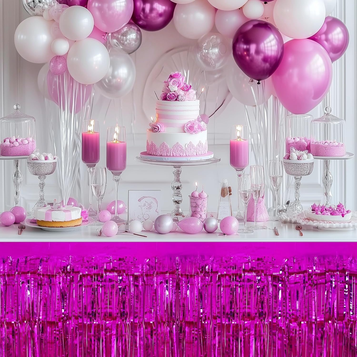 2 Pack Rose Red Table Skirts, 29x108" Metallic Foil Tinsel Fringe Table Skirts for Rectangle Tables Streamer Curtains Backdrop, Party Decorations for Birthdays Weddings Holidays