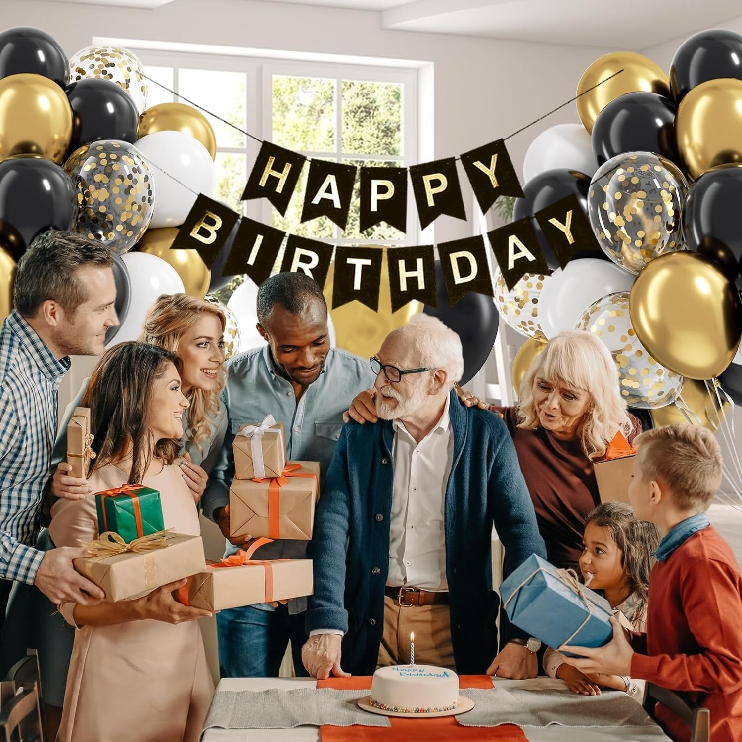 - Package Include: 12inch black balloons x20, 12inch metallic gold balloons x20, 12inch white balloons x10, 12inch gold confetti balloons x10, ribbon x1, glue dotx20
