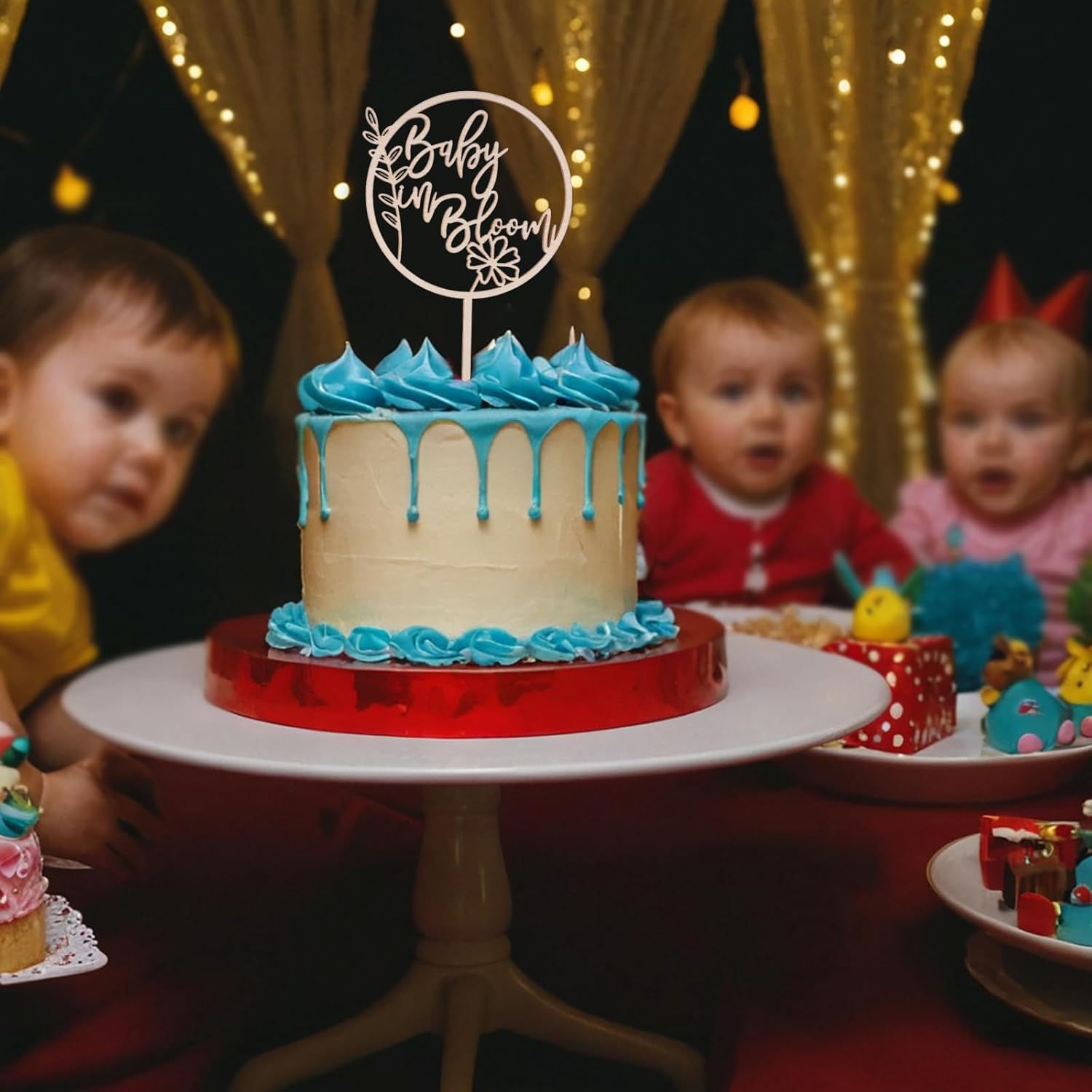 - Timeless Elegance: With its understated elegance, the Baby in Bloom Wood Cake Topper complements a broad spectrum of party themes. The wood's natural hue seamlessly blends with various decor styles, infusing your event with a sense of warmth and festivity