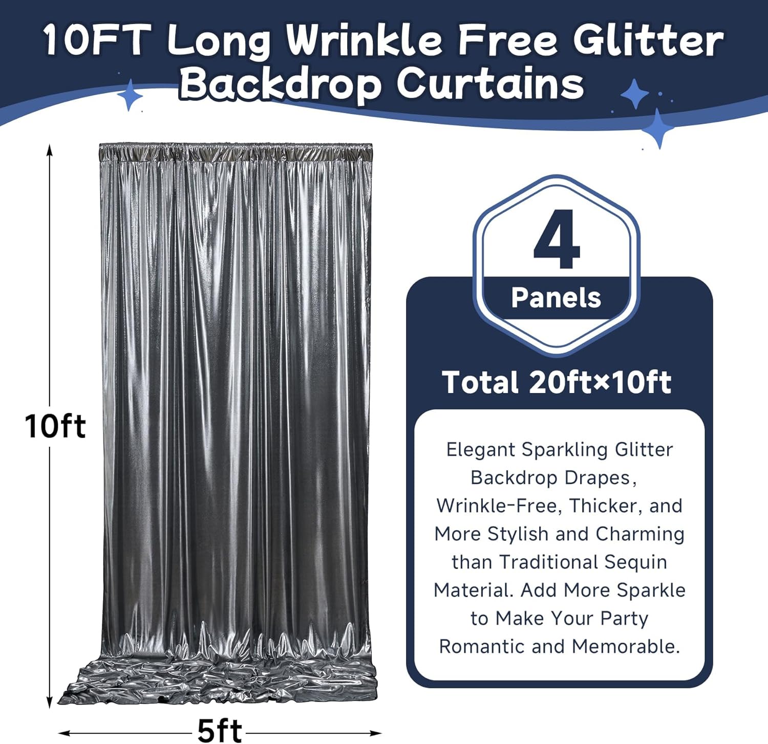 • Black Silver Backdrop Curtain 20 ft Γ— 10 ft - Your package will come with 4 panels Black Silver sequin glitter photography backdrop drapes. Each Black Silver background panels measures 5ft width and 10ft height.Entire backdrop curtain measures 20ft x 10ft.