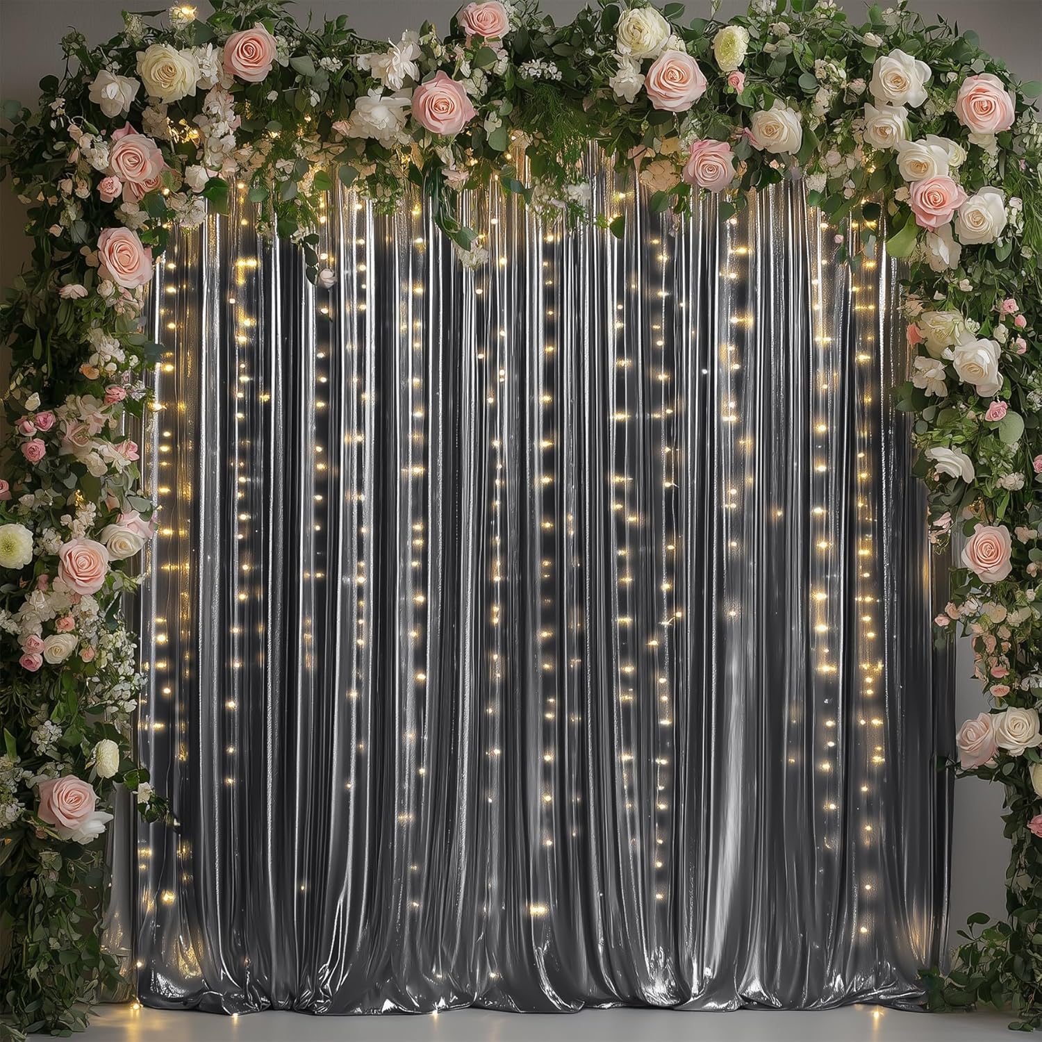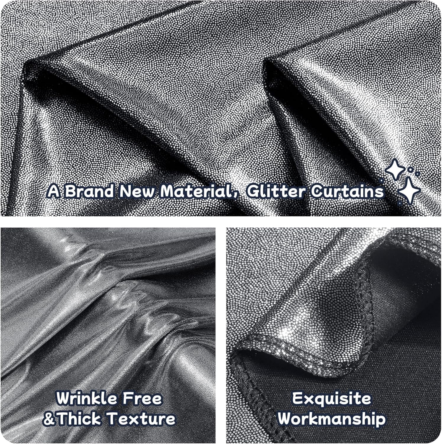 • Easy to Care Black Silver Shimmer Curtains Our 10ft Black Silver sequin glitter party background curtain panels are made of wrinkle-free material, which could be used without ironing. Let you make unforgettable memories for your family or your friends.
