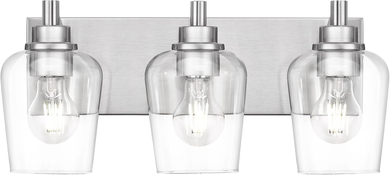 - Bulb Requirements: This brushed nickel bathroom lighting fixtures over mirror requires 3 E26 base bulbs, 60W Max. Fully dimmable when used with a dimmable bulb and dimmer switch (bulb and dimmer switch not included)