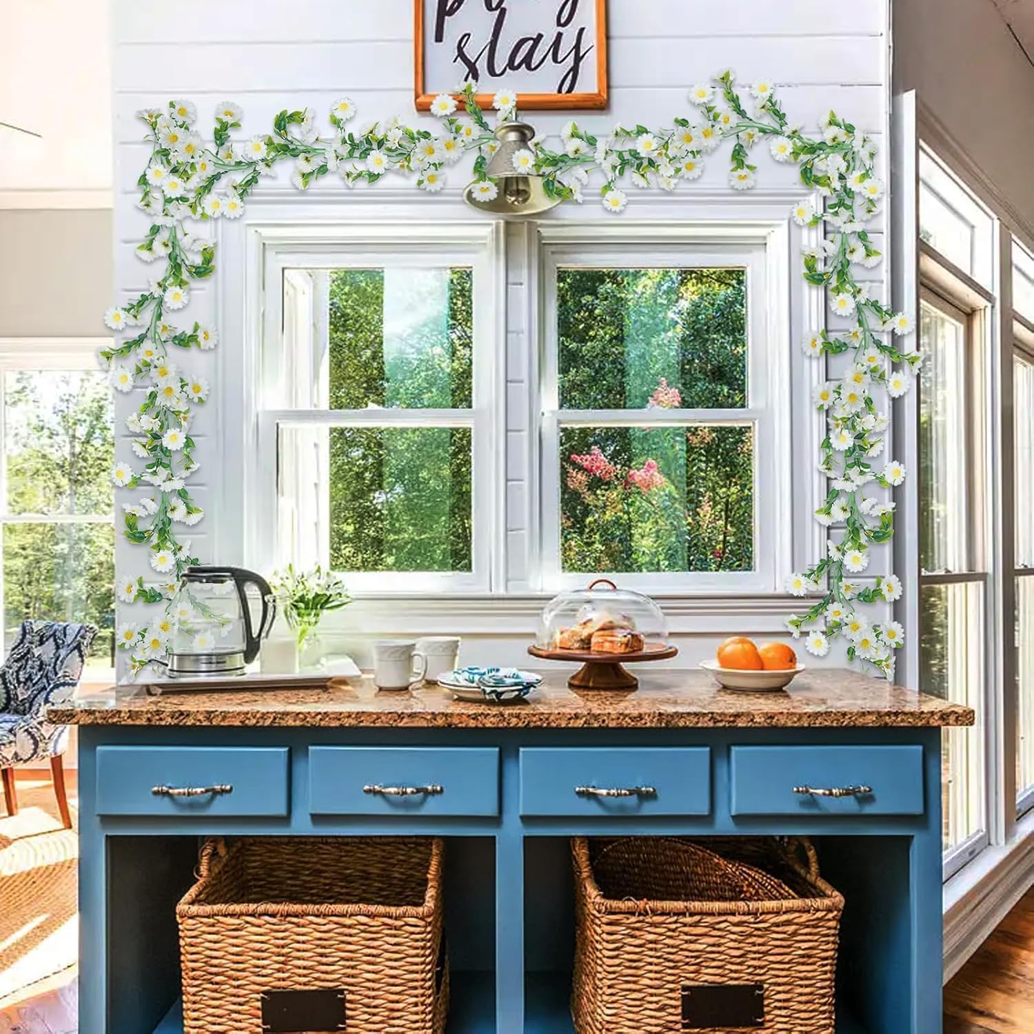 - Greenery garland with flowers are composed of silk daisy flowers, plastic green leaves and plastic stems. Silk flower heads are bright and natural in color, exquisite in workmanship, which is very suitable for lighting up your home space.
