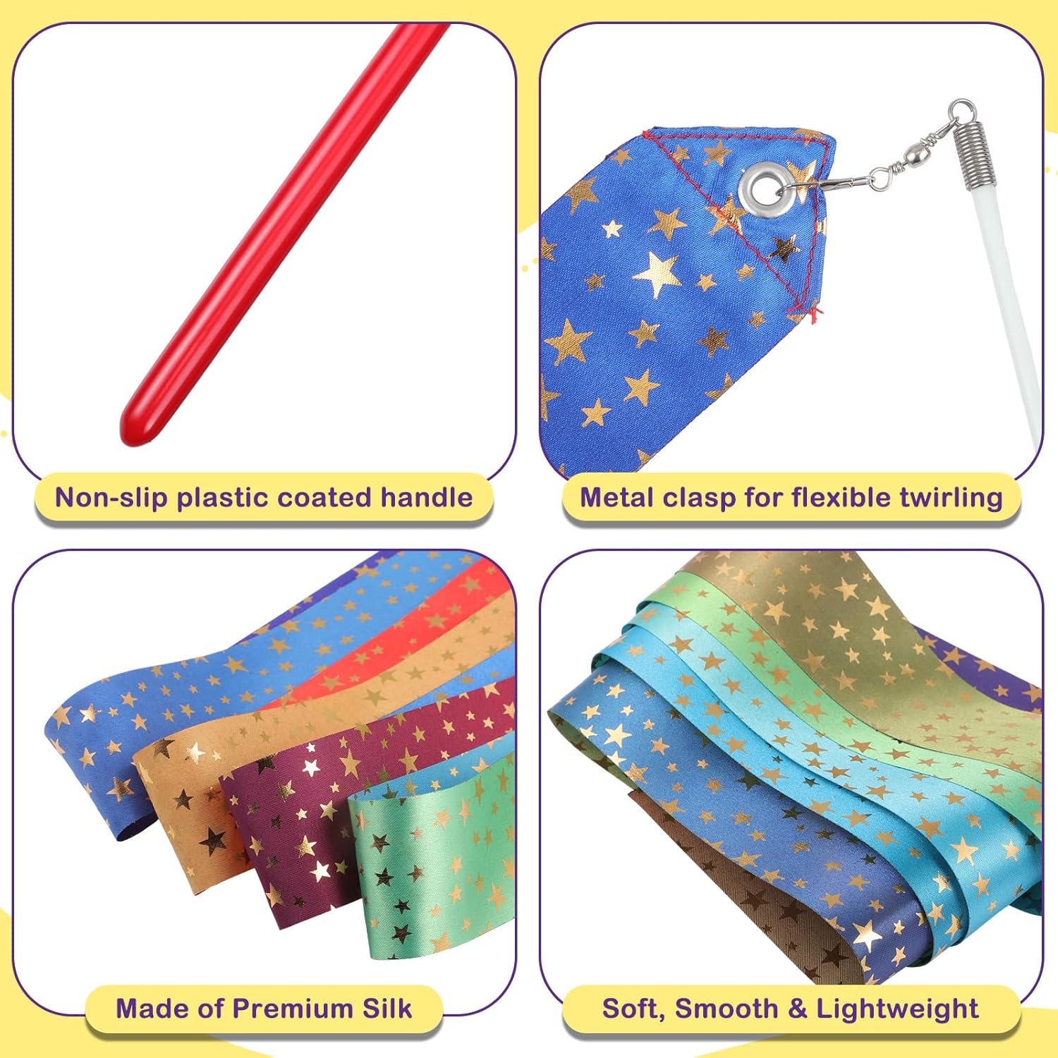 • Quality Material: the rhythmic gymnastics ribbon is made of soft satin material, lightweight and wear resistant, beautiful and bright colors printed on the surface will not easily fade; The ribbon stick is sturdy and hard to break, can serve you for a long term; The handle does not slip easily when twirling the ribbon; Metal buckle at the top of the stick provides flexible rotation for the ribbon