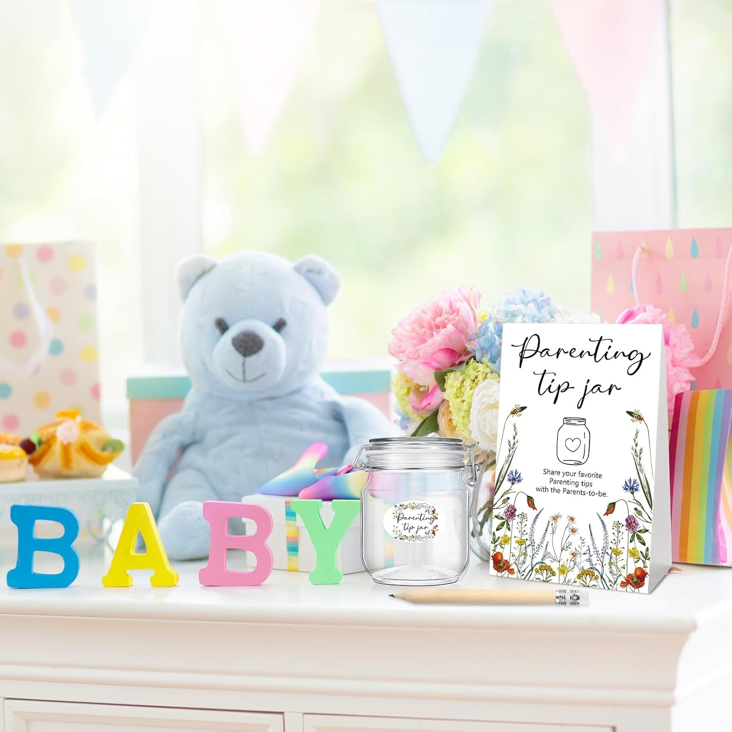 Roowest Baby Shower to Baby Advice Cards for New Parents to Be - Tip Jar Sign for New Parents 60 Parenting Advice Cards 10 HB Pencils 2 Cute Stickers 1 Pet Bottle for Guests Games(Wild Flower)