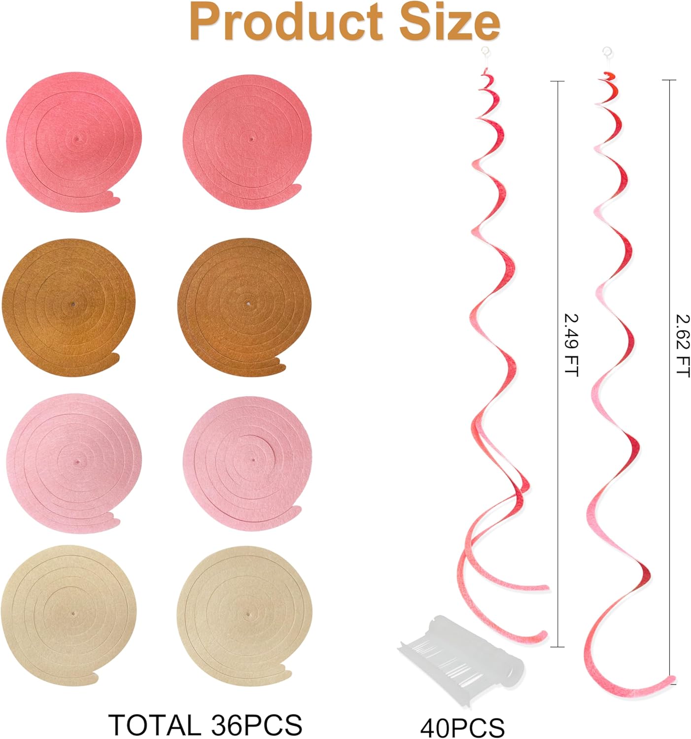 36 Pcs Boho Hanging Swirl Decorations Brown Blush Pink Felt Swirl Streamer Spiral Ceiling Garland for Birthday Engagement Baby Shower Bachelorette Wedding Bridal Shower Holiday Hen Party Supplies