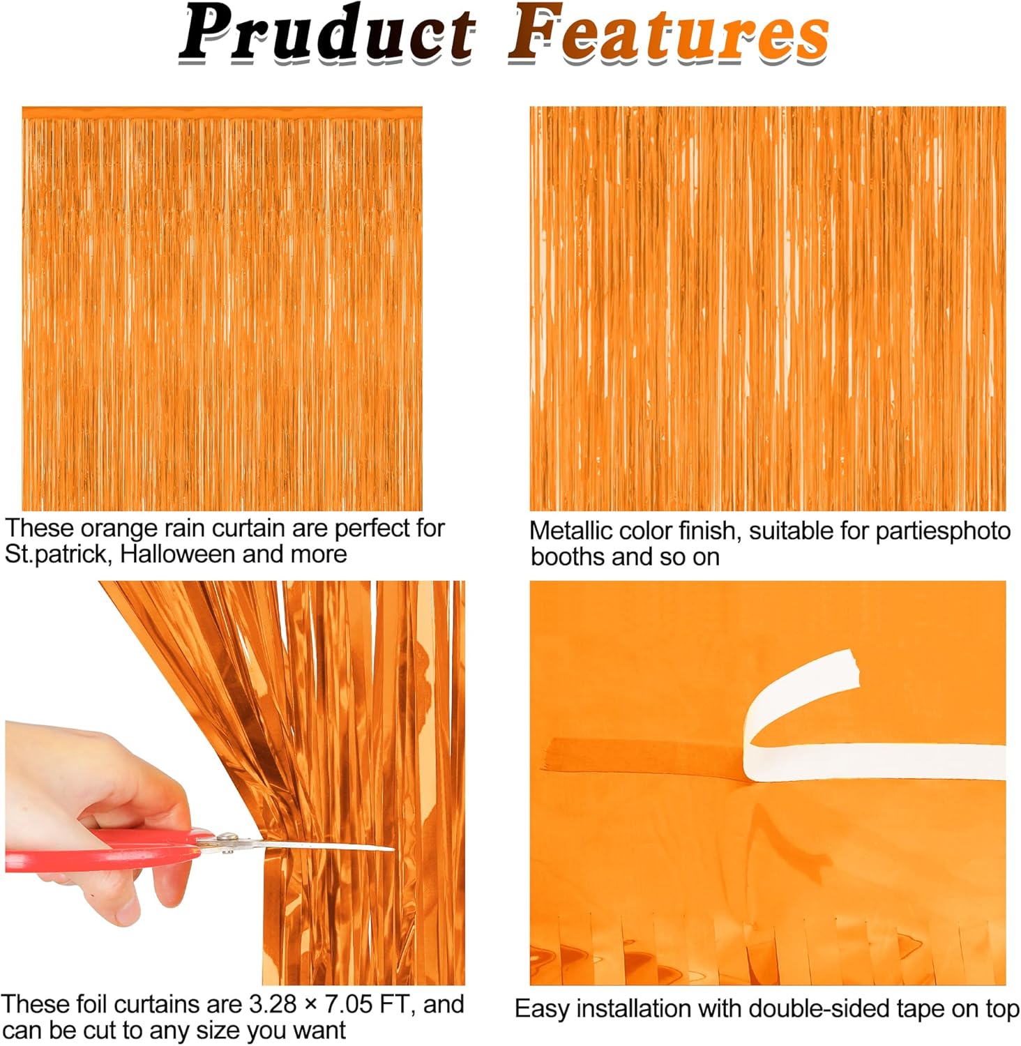 - Design: These foil curtains feature a orange color along with a metallic finish, creating a mysterious and slightly scary atmosphere.