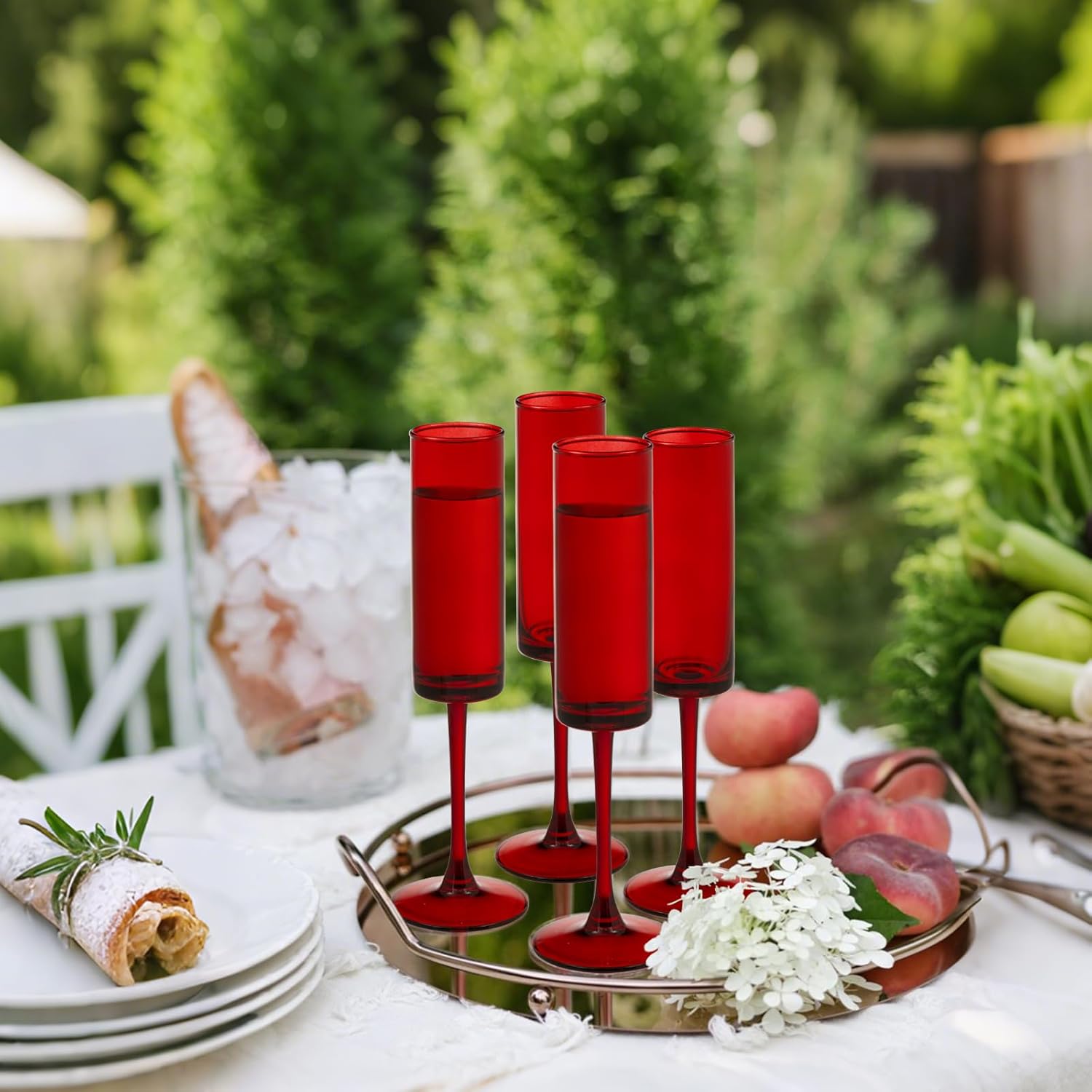 6 Pieces Red Champagne Flutes 6 OZ Straight Sided Wine Glasses Champagne Long Stem Drinking Colored Glasses,Set of 6 Hand Blown Champagne Flutes Goblets for Wedding Cocktail Cups,Cava, Prosecco
