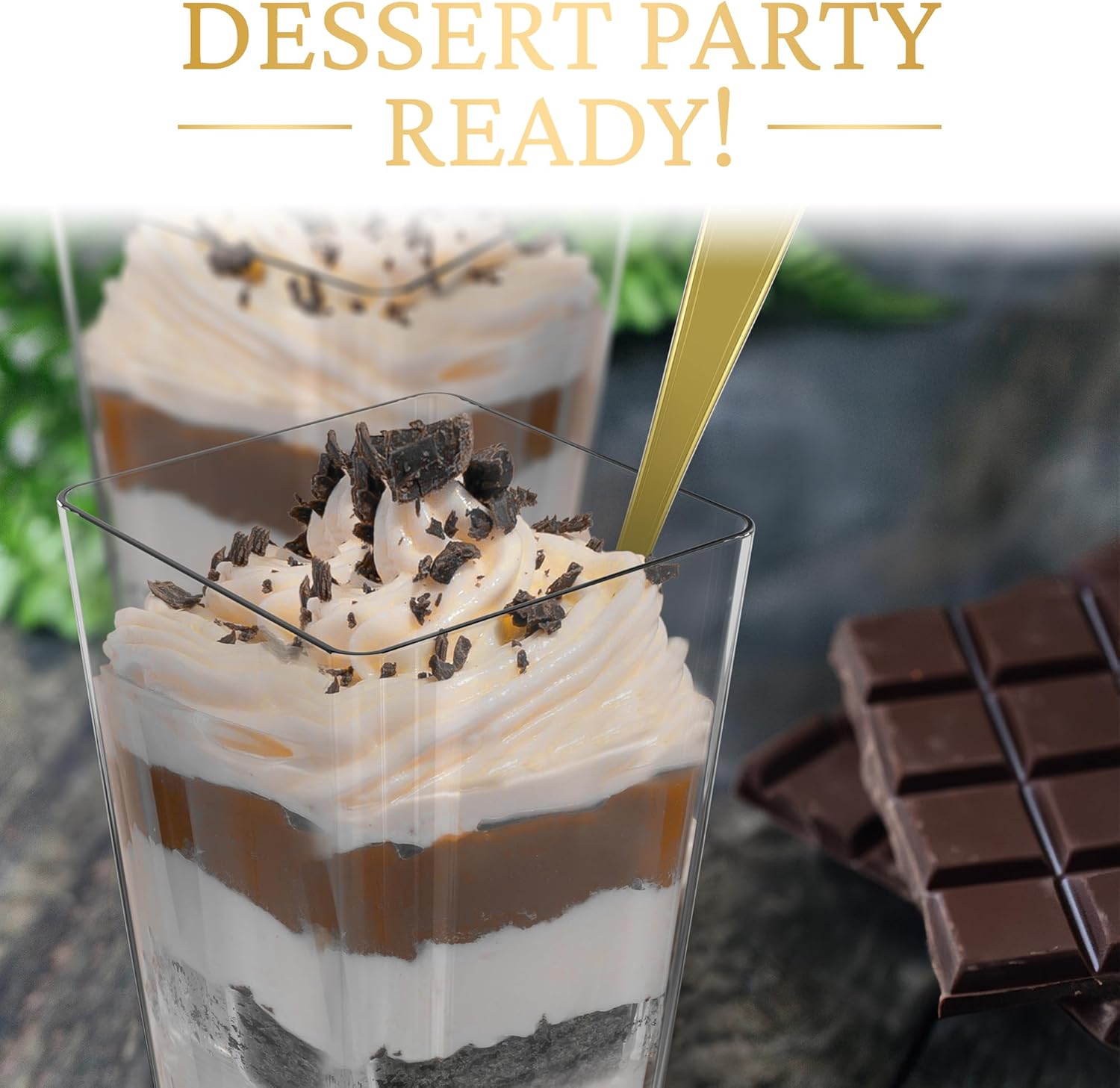 - ADD A TOUCH OF LUXURY to your desserts and serve them with the beautiful glossy golden spoons that are included with each dessert shooter cups with spoons pack. The crystal-clear acrylic of these 3oz plastic dessert cups lets you display your desserts in style.