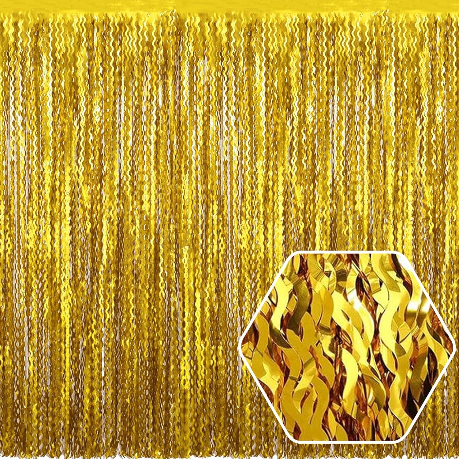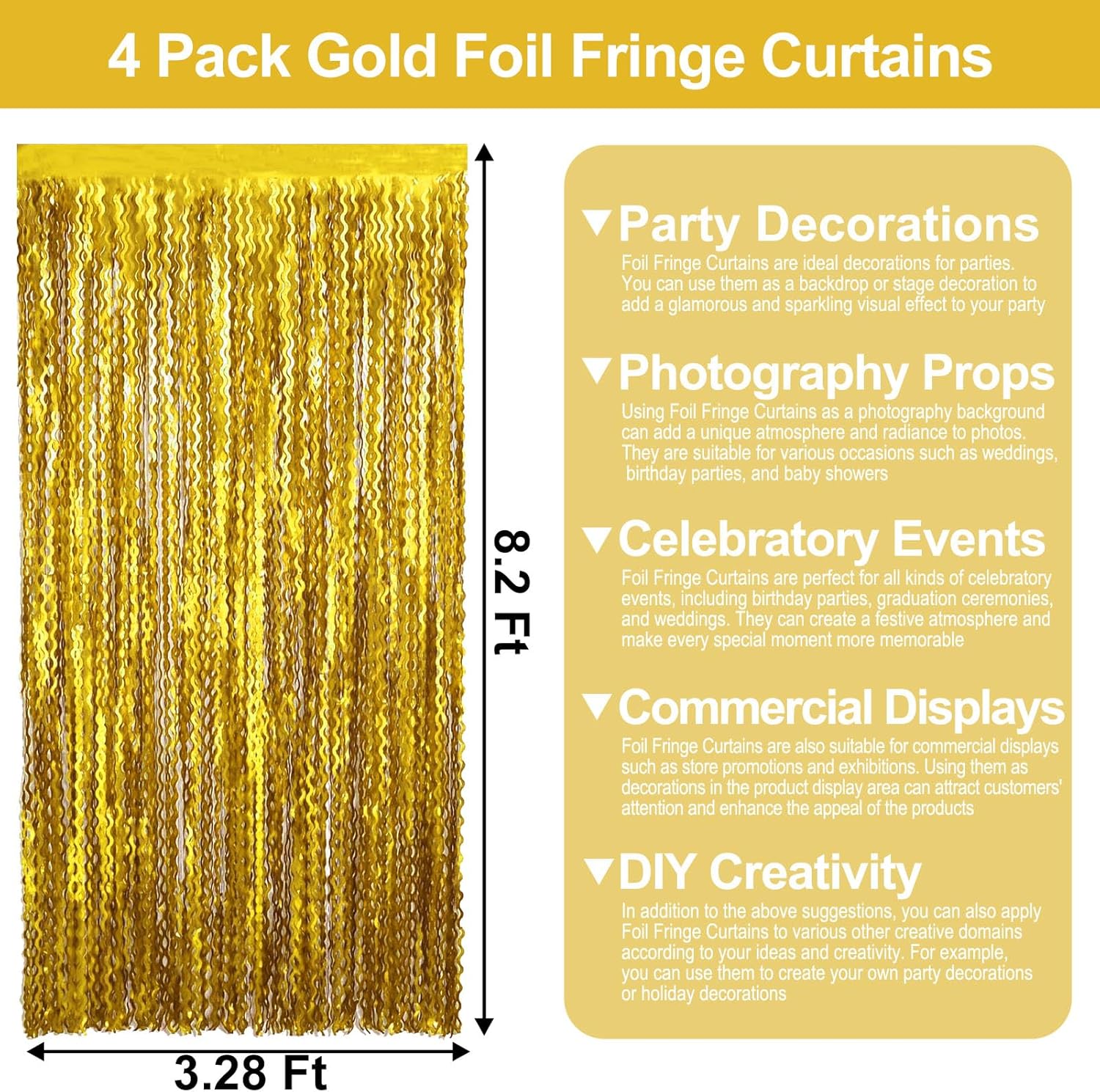 4 Pack Gold Wave Foil Fringe Curtain Backdrop, 3.28Ft x 8.2Ft Metallic Tinsel Foil Fringe Streamer Curtains for Photo Booth, Mother's Day, Easter, Birthday, Wedding Party Decoration