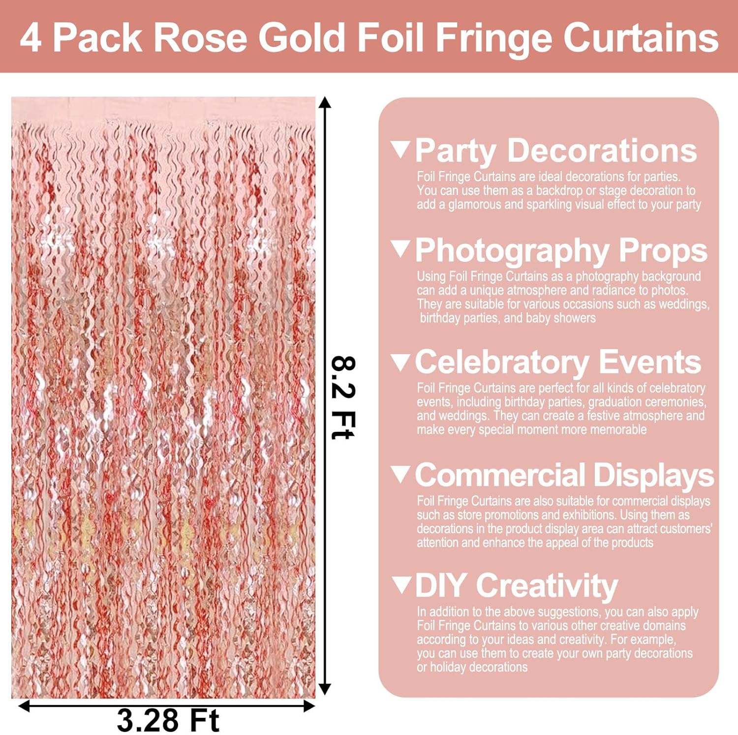 - Easy To Assemble | Strong Adhesive | Not Easy Fade : The foil fringe curtain backdrop party decorations come with double-sided adhesive tape, easy to use, just tear off the back of adhesive tape, then paste this streamers backdrop curtains on the top of wall, window, table, or as door fringe decoration.