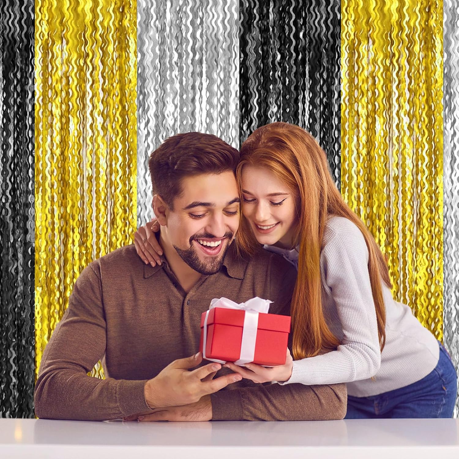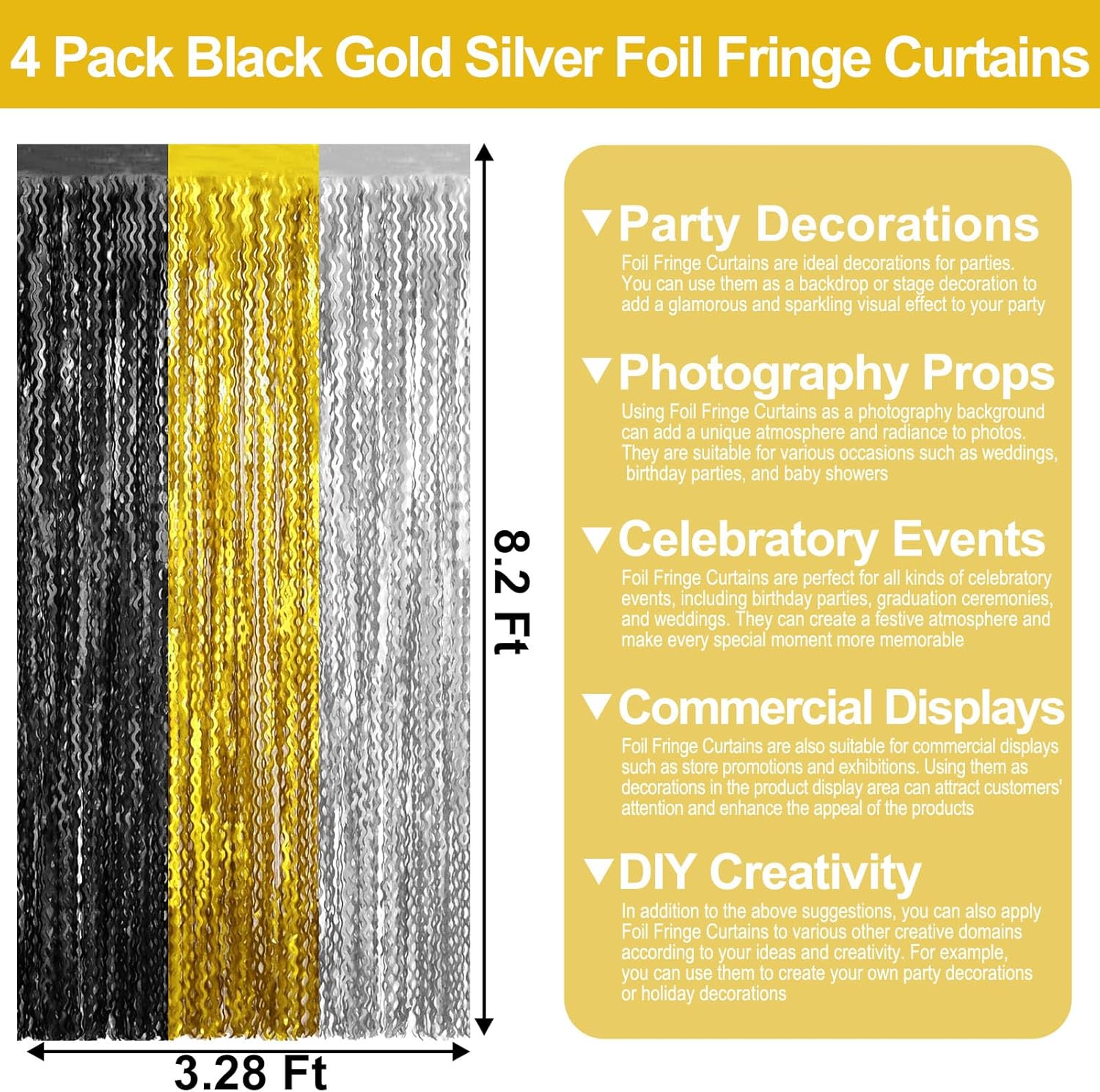 4 Pack Black Gold Silver Wave Foil Fringe Curtain Backdrop, 3.28Ft x 8.2Ft Metallic Tinsel Foil Fringe Streamer Curtains for Photo Booth, Mother's Day, Easter, Birthday, Wedding Party Decoration