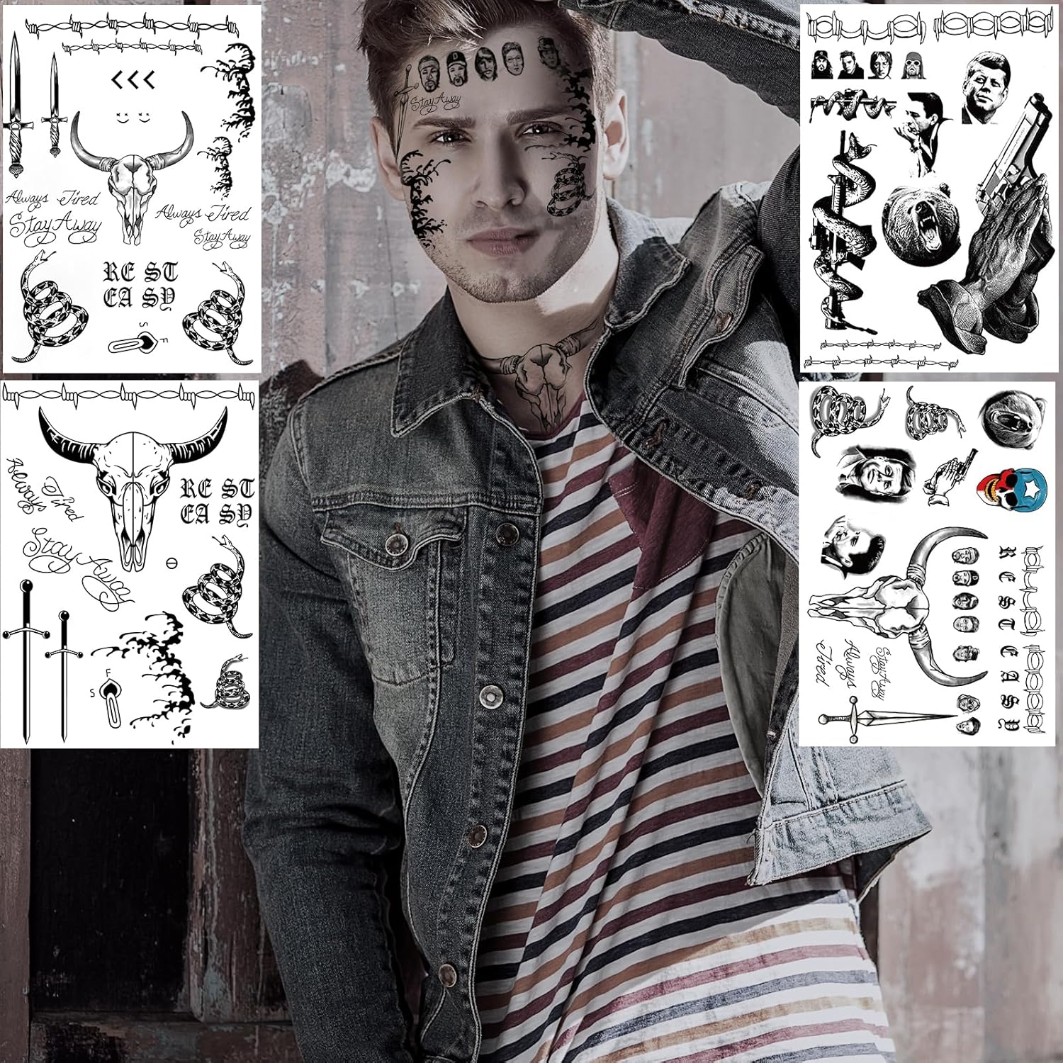 - 【MORE QUANTITY】Our Halloween face tattoos and fake tattoos set with 12 sheets, include 4 sheets cosplay rapper inspired temporary tattoos face tattoo set(size 21*15 cm/8.3*5.9 inch), 10 sheets Halloween temporary tattoos for cos play(size 10.5*6cm/4.1*2.4 inch). Face tattoos accommodate to different faces, enough to share with friends.