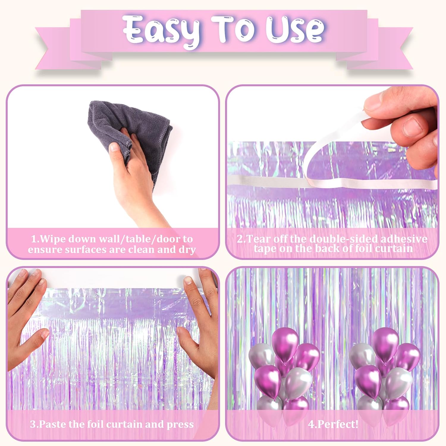 - How to Set up: Wipe down wall/table/door, ensure surfaces are clean and dry, tear off the double-sided adhesive tape, paste the foil backdrop curtains and press. Hang each individual tinsel fringe curtains in different locations for a fuller effect