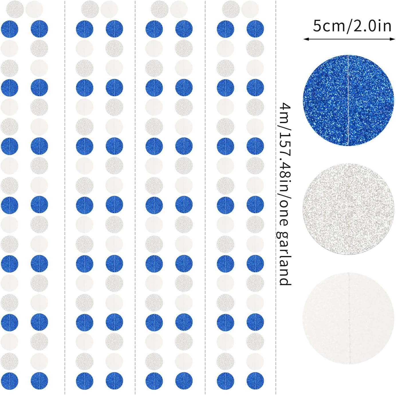 - PACKAGE CONTAINS: This set has four navy blue white silver circle paper garland,the length of each strand is 4 meters/13 feet, the total length is 16 meters/52 feet.The size is 2IN.