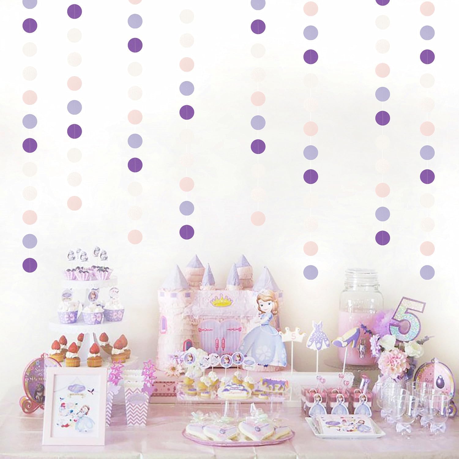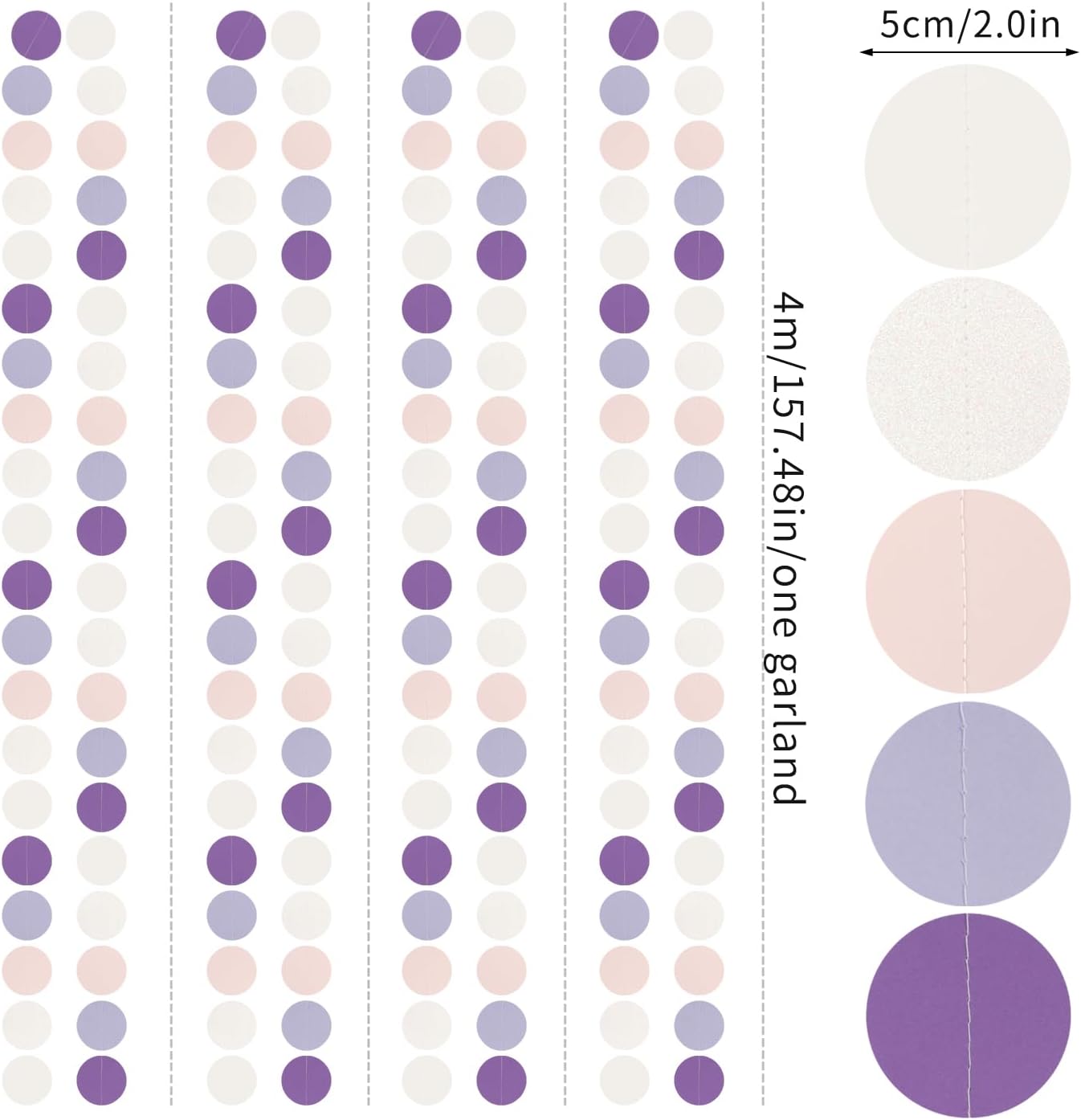 - PACKAGE CONTAINS: This set has four purple white pink paper circle garland,the length of each strand is 4 meters/13.1 feet, the total length is 16 meters/52.5 feet.The size is 2IN.