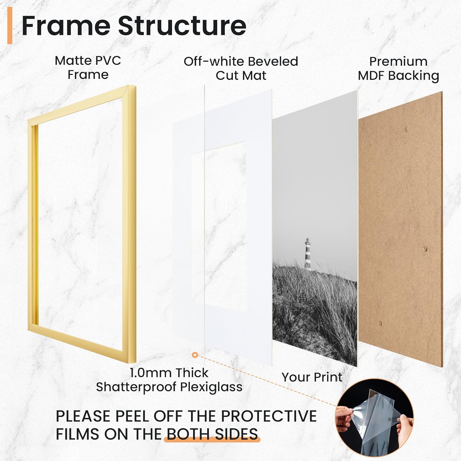 - Display Precious Memories - Showcase your cherished moments with our 11x17 plastic frame. It's lightweight yet sturdy with a superior quality finish. The white mat opening (measuring 7.5x11.5) is perfect for a 8x12 picture with the mat, or an 11x17 picture without it.