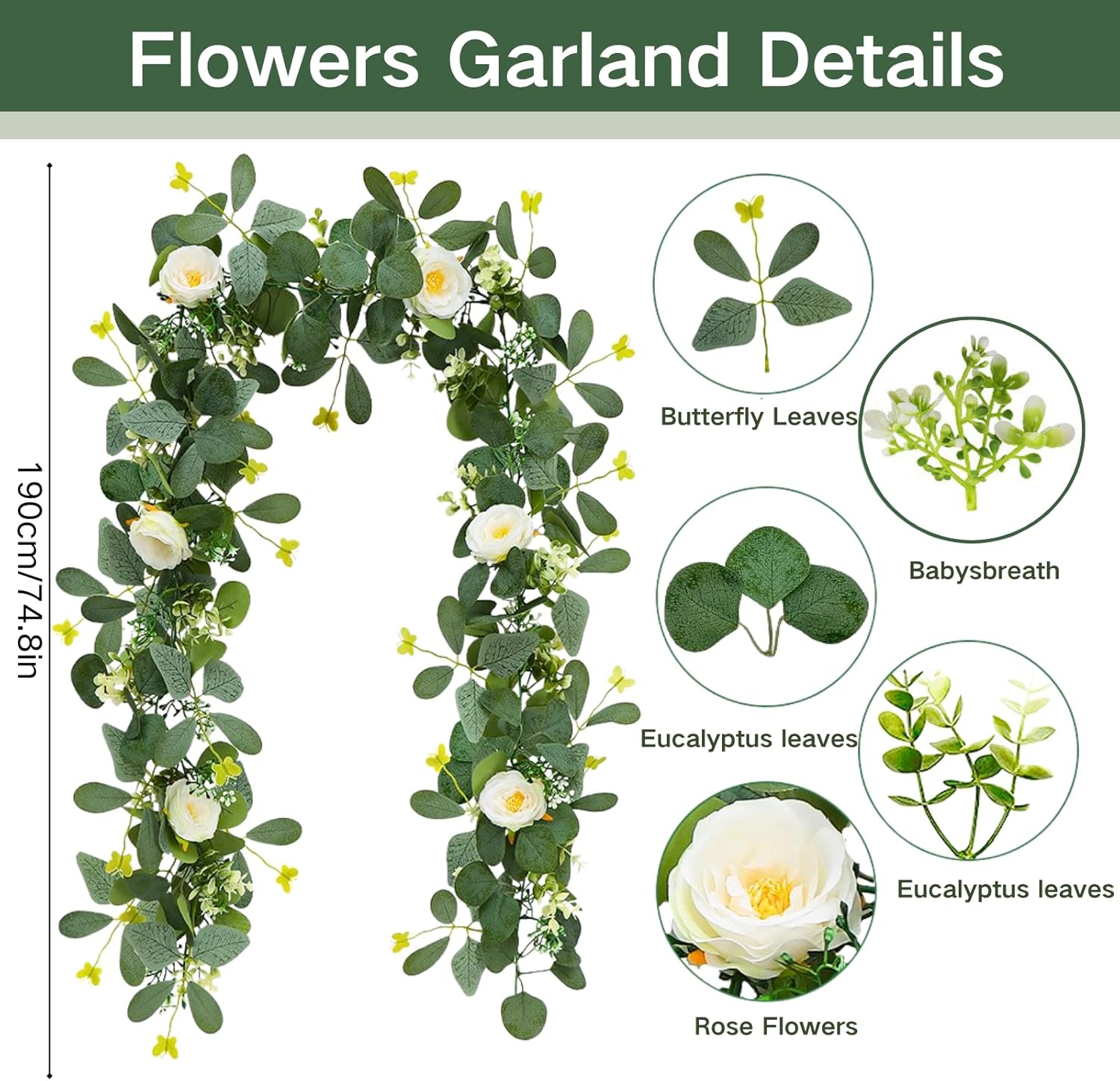 - 【 Spring Garland for Home 】 Package includes 2 packs 6ft eucalyptus garland, One Pack is a roses Garland with 6 rose heads and the other Packs is a common eucalyptus leaf flower vine without roses. the vines perfectly blends realistic and natural rose flowers with eucalyptus leaves. Perfrct for Spring decoration, centerpiece table decorations, table runner, wedding decor and home decor.