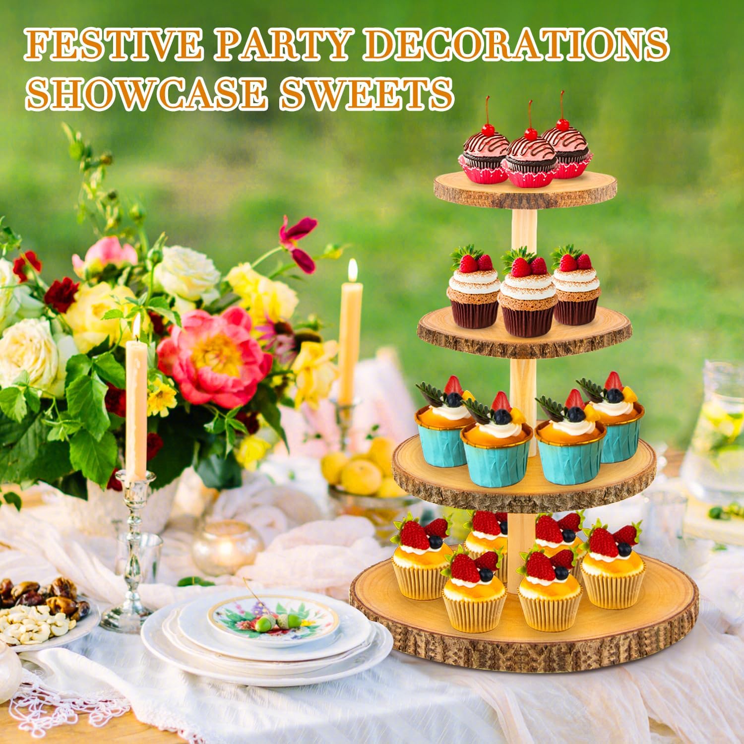 - Elegant Design: This 4-tier cupcake stand boasts a rustic farmhouse style with a distressed wood finish, perfect for displaying your delectable treats in a charming and eye-catching manner.Natural Rustic Charm: Crafted from premium paulownia wood with intact bark, this 4-tier cupcake stand exudes a natural and rustic vibe, perfect for woodland-themed events and farmhouse decor.