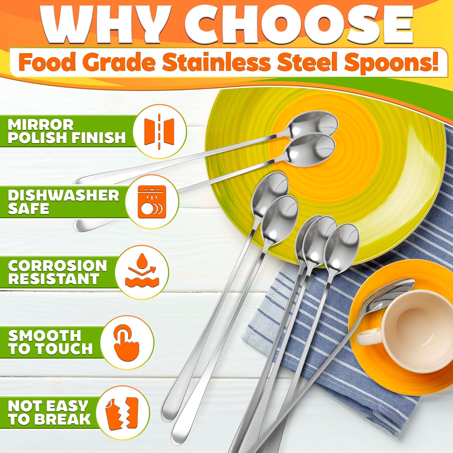- 🍨Reliable Long Tea Spoons Set: Our long handle tea spoons are made from stainless steel with an ergonomic handle and a high-polish finish, ensuring durability, a comfortable grip, and a sleek look