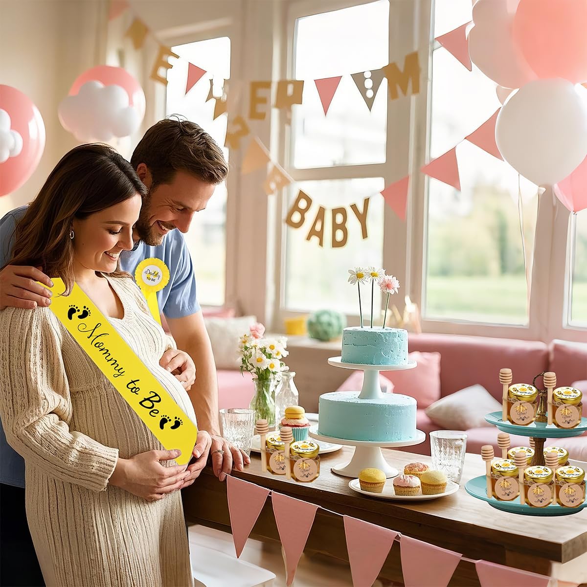 - 【Great Value Honey Jars Set】60pcs 1.5oz Hexagon Glass Honey Jars with gold sealing lids, also comes with 60pcs wooden dippers, 60pcs bee pendants, 60pcs golden gift bags, 60pcs thank you cards, 60pcs cute stickers, 33m jute twine and Sash & Badge set , allowing you to contain honey conveniently. Meeting all your requirements for the coming baby shower!