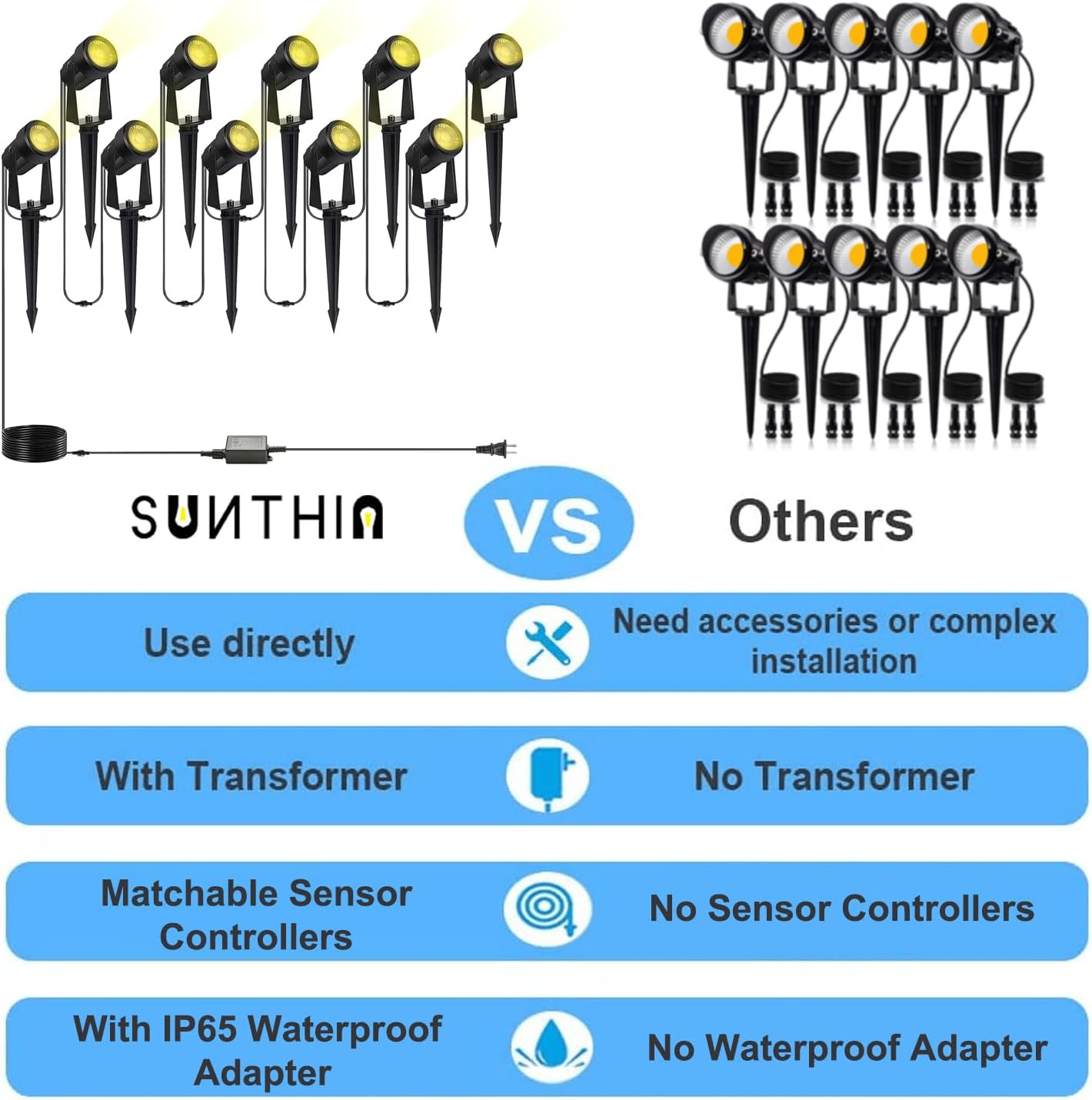 SUNTHIN Outdoor Landscape Lighting, 10 Pack Outdoor Spot Lights with Transformer for Yard, Plant, Lawn, Tree, Flags, House, Garden, Fence Use, IP65 Waterproof & Connectable