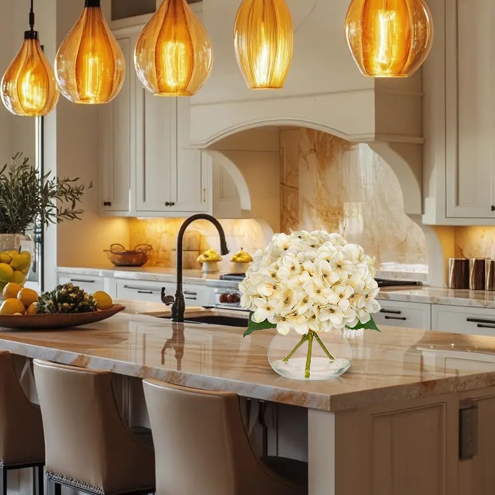 - 💐【Realistic & Elegant】Fall hydrangea artificial flowers for decoration with glass vase suits look so beautiful, unique craft design, brings different visual enjoyment to your home, create a romantic atmosphere, make you happy every day. Faux water on the vase adds to the pulchritude and realism. More realistic because of the details!