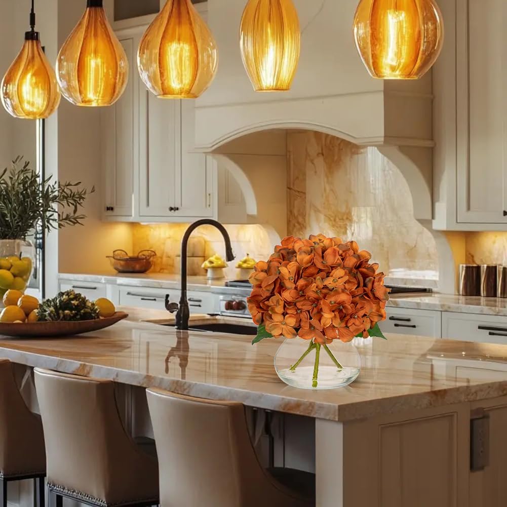 Hollyone Dark Orange Fall Hydrangea Artificial Flowers for Decoration with Glass Vase Silk Faux Flower Arrangements with Faux Water Fake Bouquet Table Centerpiece Vase with Flowers Autumn Home Decor