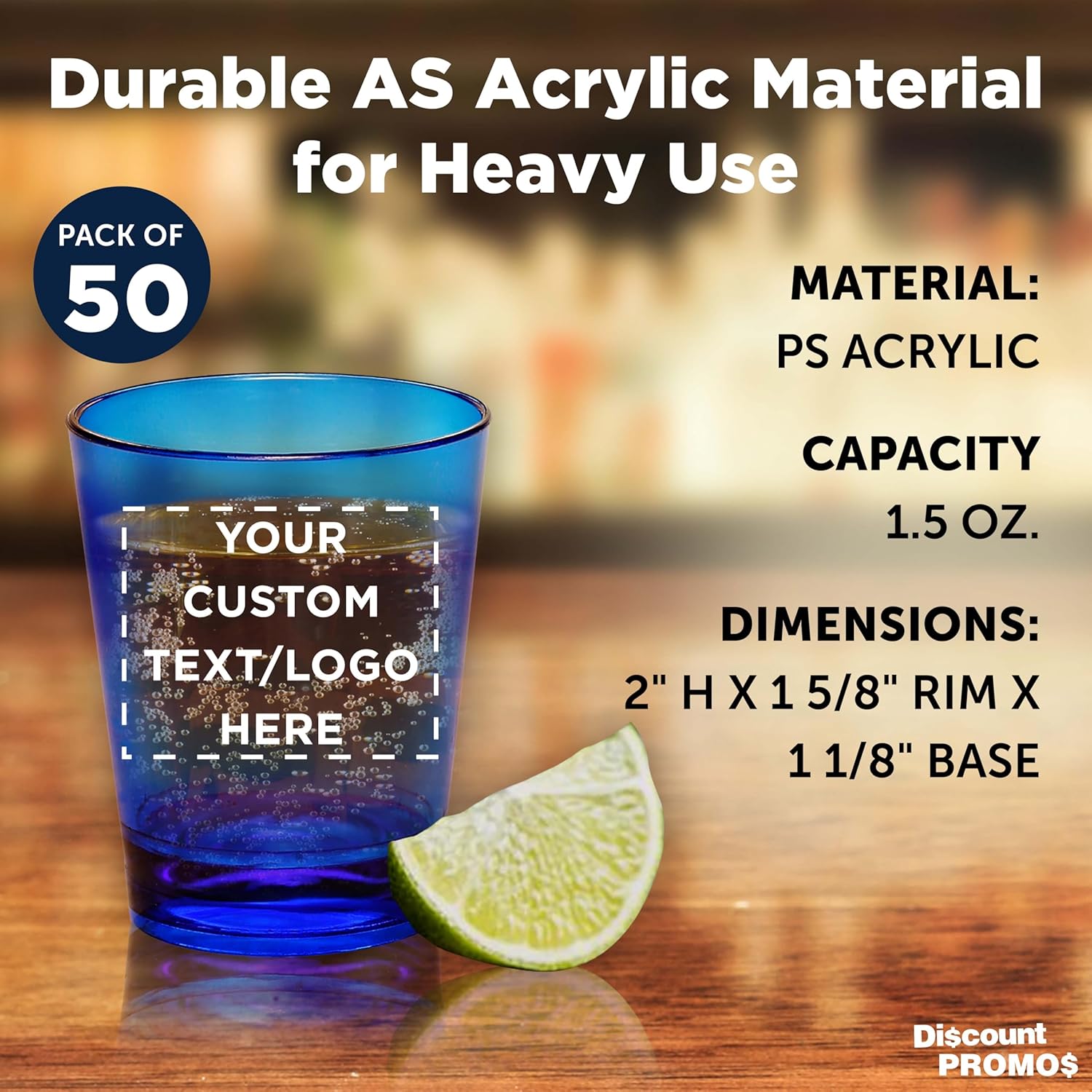 Custom Translucent Plastic Shot Glasses 1.5 oz. Set of 50, Personalized Bulk Pack - Acrylic, Great for Wedding, Party, Birthday, Gifts - Blue