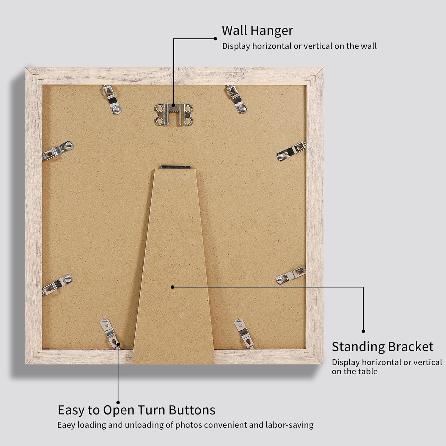 - Multi Frames Collage Set: Includes 4 frames in the same size. Perfectly fits 10x10 inch pictures with mat or 12x12 inch without mat. The frame opening display size is 0.5 inches smaller than the photo size for secure mounting.