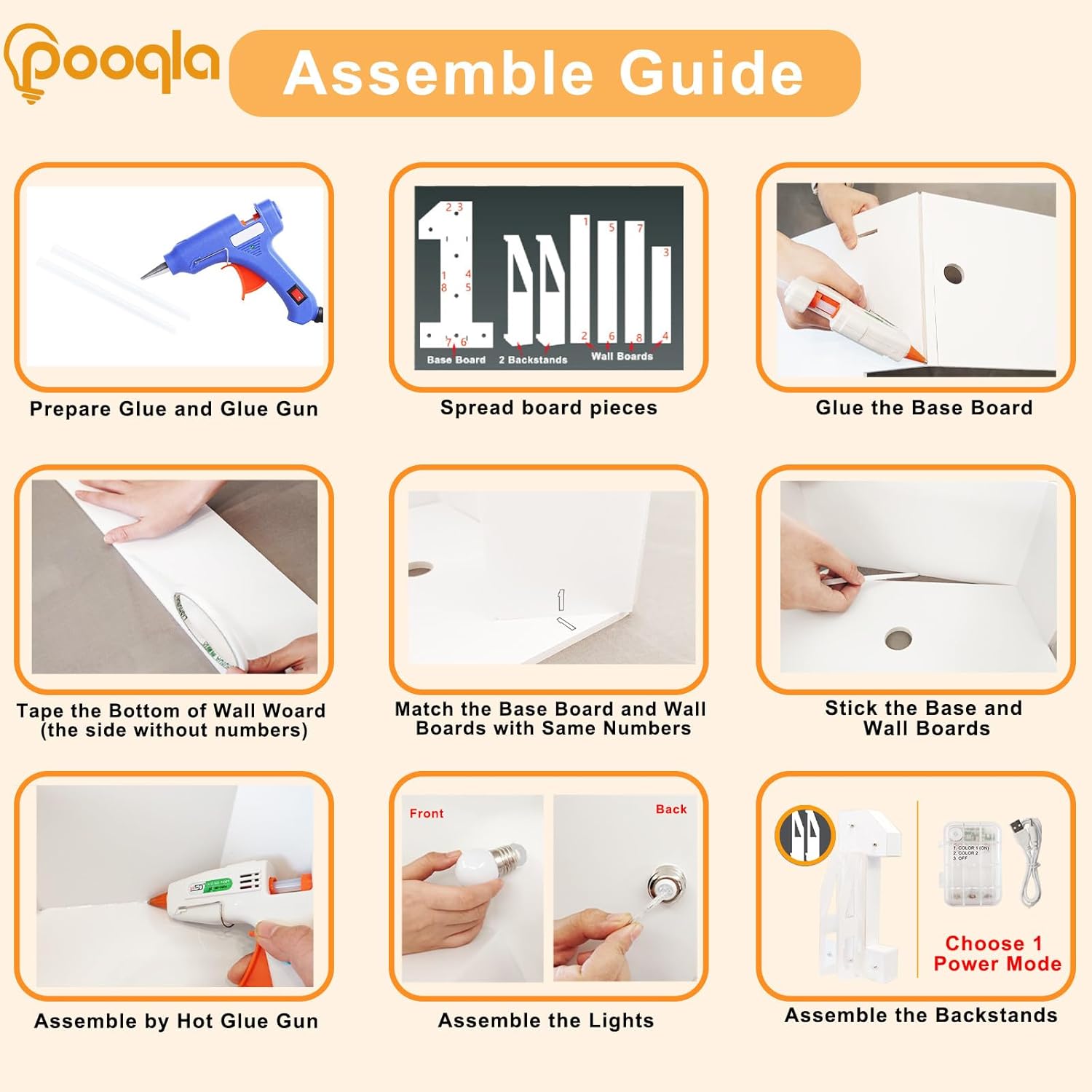 - Easy Assembling Procedure: Pre-cut frame marquee numbers are easy to set up: 1) Glue the base board and match the base board and wall boards according to same number. 2) Glue the base board and wall boards together. 3) Screw the bulbs into the board, connect LED lights and power on. (Noted: Glue gun, glue and batteries are not included) Let the installed marquee numbers light up every scene you need