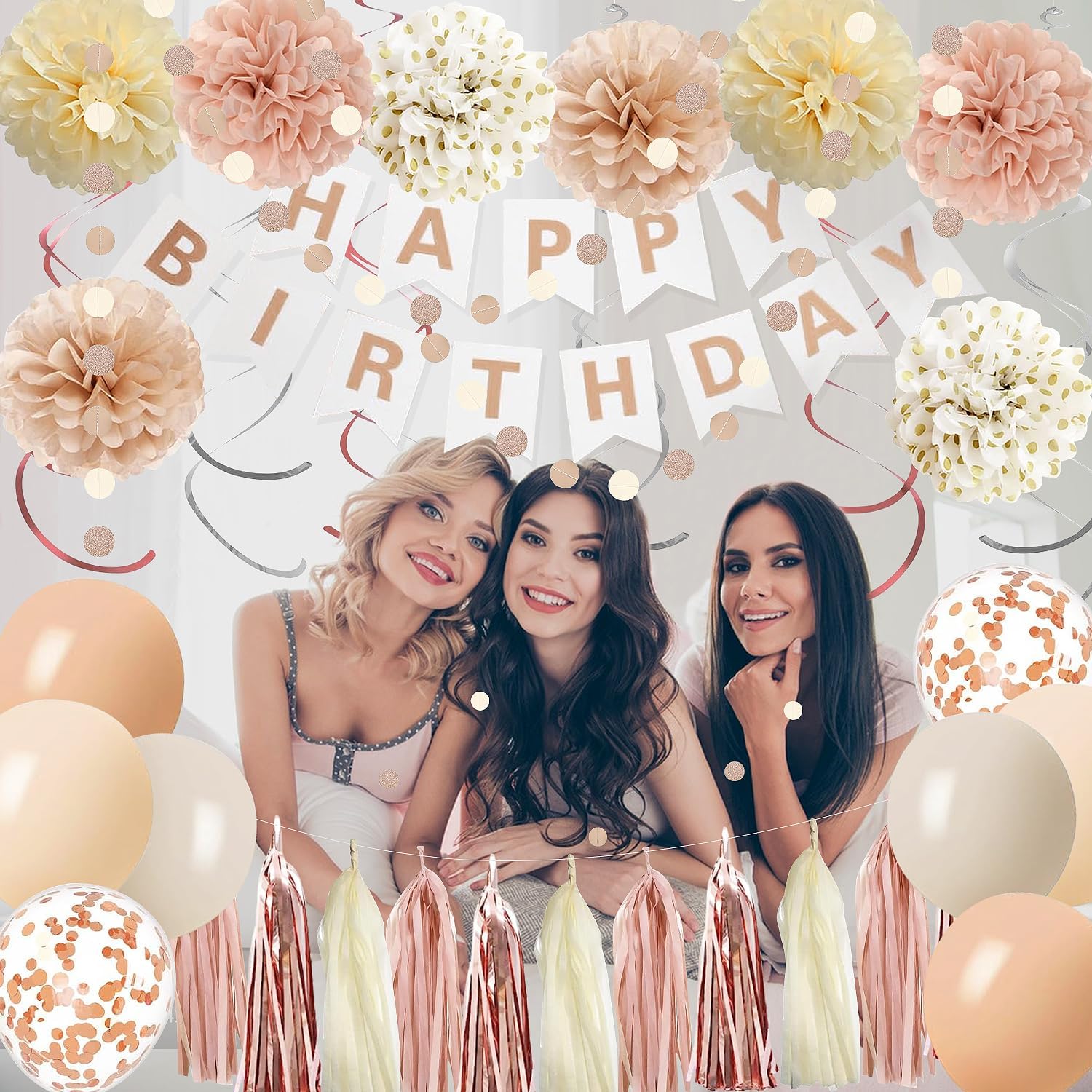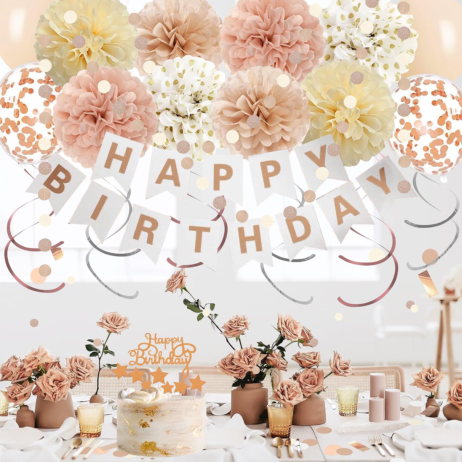 Rose Gold Birthday Party Decorations Kits with Happy Banner,Cake Topper,Hanging Swirls,Tissue Paper Pompoms,Paper Tassels Garland,Confetti Balloons for Women Girls Birthday Party