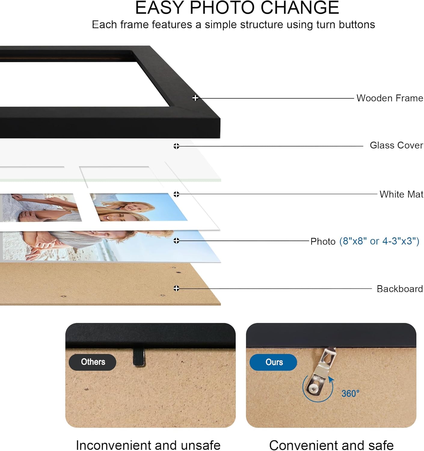 - Fit for 2 Sizes Photos - This 8 by 8 picture frames can display 8x8 picture without mat, 4 opening 3x3 picture with mat. The actual mat opening was designed slightly smaller than photo itself in order to hold it steadily while not a defect