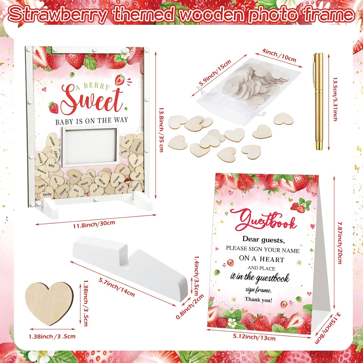 - Strawberry Baby Shower Decorations: you will receive a strawberry theme baby shower guest book with photo frame in 11.81 x 13.78 inches/ 30 x 35 cm, 1 pen, 60 heart wood cutouts, 1 organza bag, 2 display shelves, enough to meet the needs of your strawberry themed baby shower party