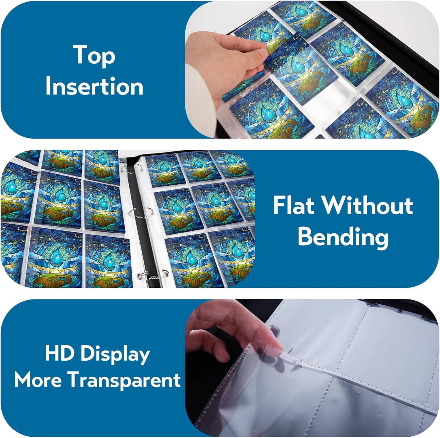 - Function : -Trading Card Binder can not only protect and organize cards, waterproof, scratch-proof, dust-proof, and anti-lost. Advanced reinforced heat-sealed seams technology for trading card binder 9 pocket, flipping through the pages like a book will different with regular MTG binder, even no rings to mess up cards. The side loading pockets also means no cards falling out if you hold the photocard collector upside down