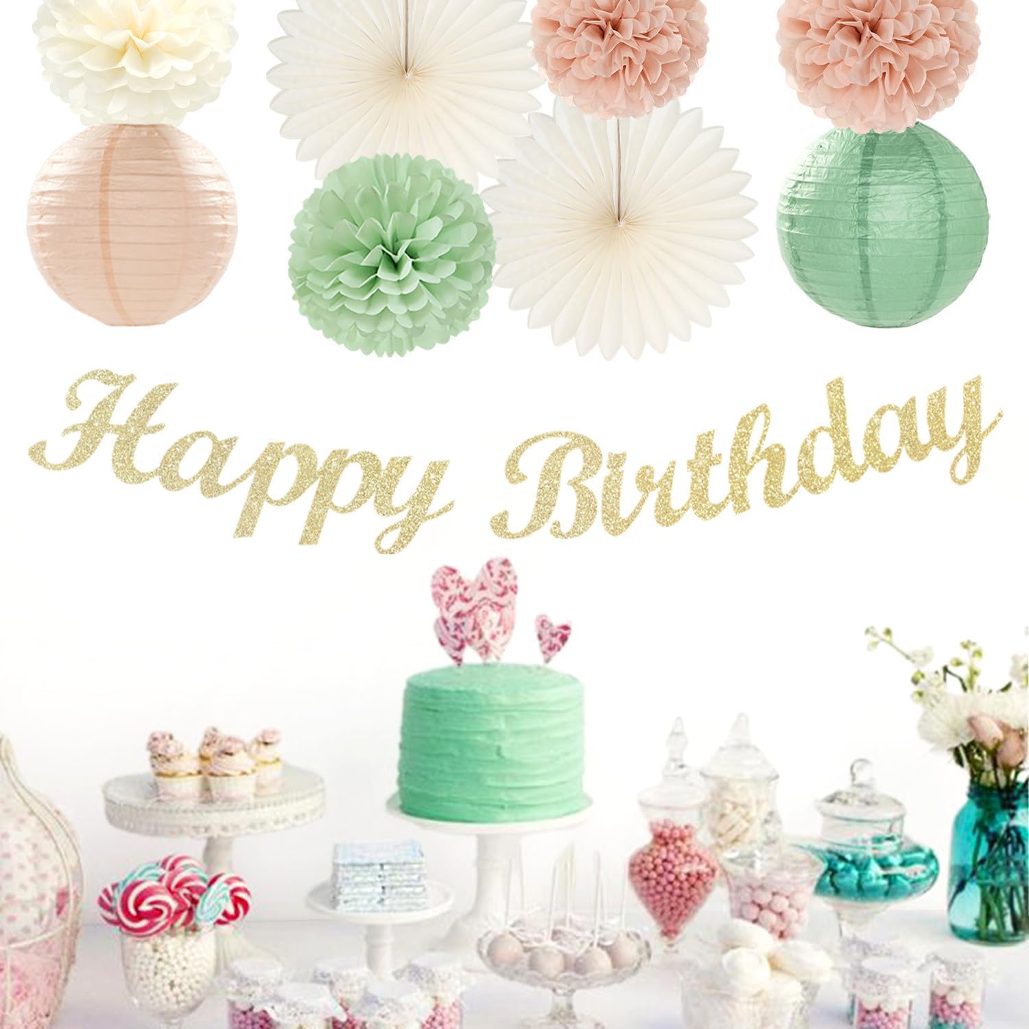 - Package Includes: This kits include 1pcs gold happy birthday banner, 1pcs circle dots paper banner, 10pcs tissue pom poms, 2pcs paper lanterns, 2pcs paper flower fans, 6pcs paper swirls hanging streamers in sage green and blush pink colors, and different sizes