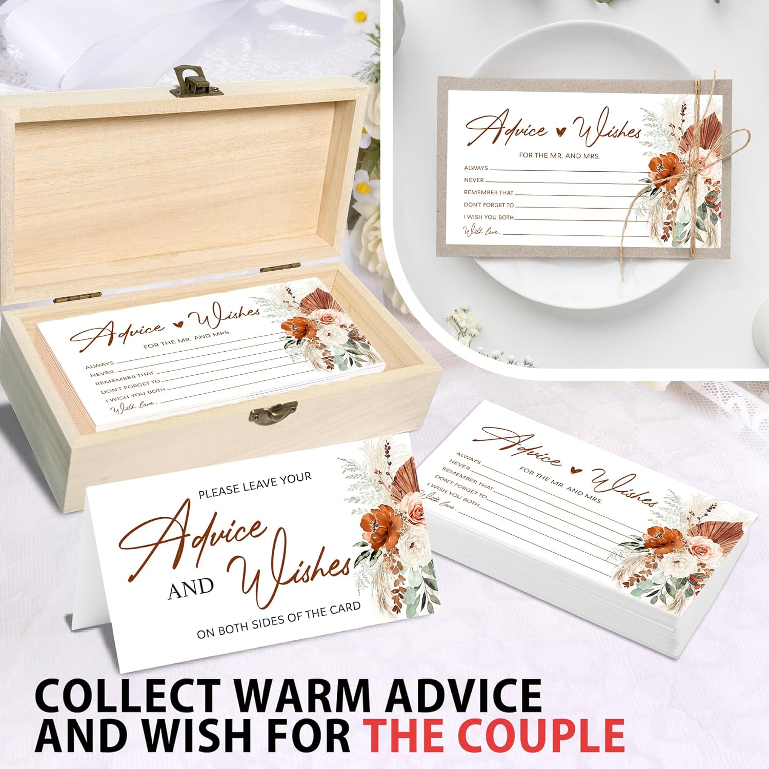 - Set Includes: Elevate your celebration with our deluxe set that includes 50 Pcs marriage wishes cards, an advice and wishes box for couples wedding shower decorations