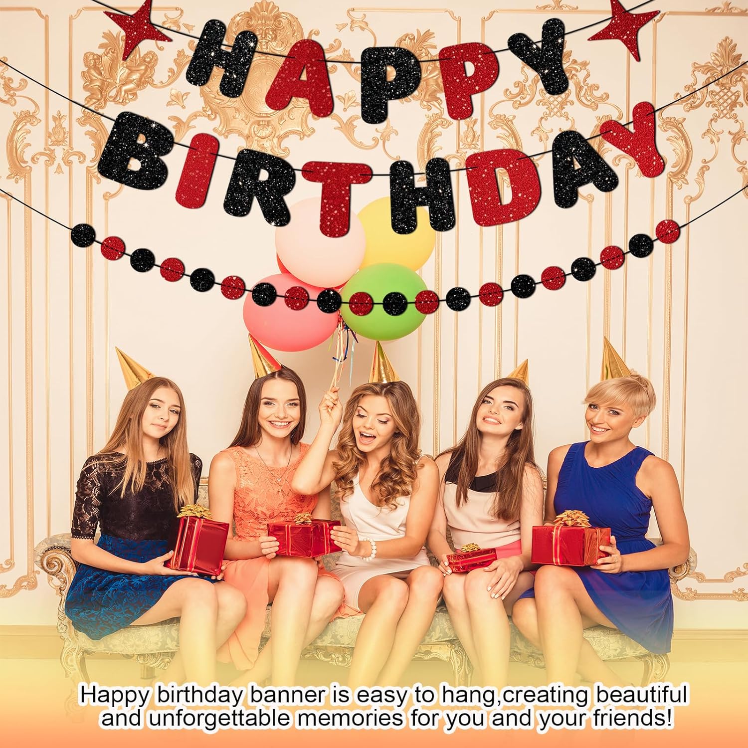 - Excellent Design: Happy birthday banner red and black is designed with circle,star shape and "HAPPY BIRTHDAY",include 2pcs star shape,20pcs circle garland.These shiny elegant birthday decor are expertly crafted to create a fabulous and elegant ambiance,enhancing your birthday experience.