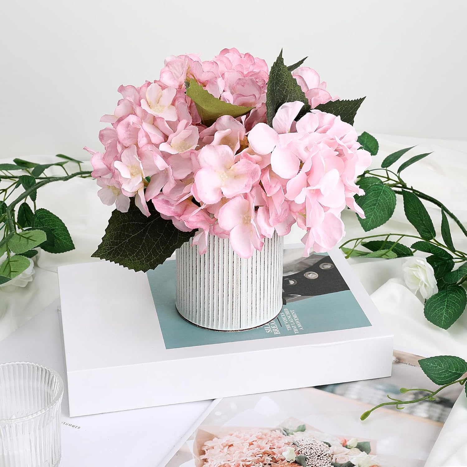 Flower Table Centerpieces - Set of 6 Floral Arrangement Artificial Wedding Hydrangeas Floral Arrangement with Rustic Metal Vase for Bridal Tea Party Event Decorations - Pink