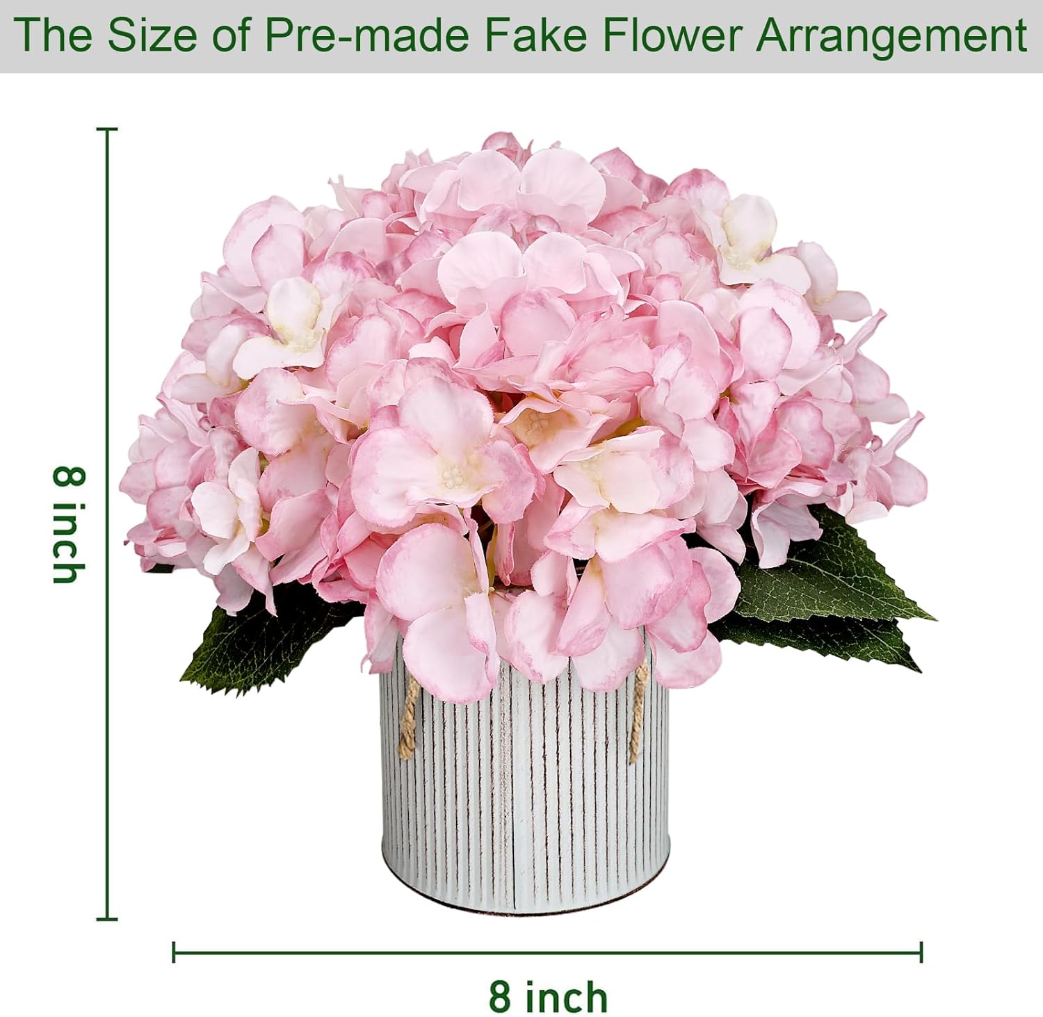 - Pack of 6 pre-made artificial flowers with rustic metal pot for table centerpieces. Consists of high quality pink fake roses and faux hydrangeas.