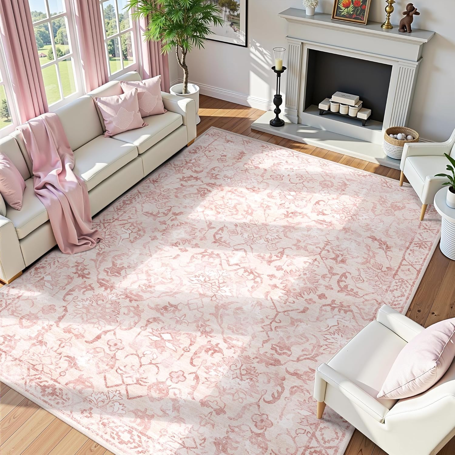 Pink Area Rugs 8x10 Rugs for Living Room, Traditional Washable Rugs for Bedroom Distressed Large Area Rug Living Room Rug Non Slip Rug Carpet for Dining Nursery
