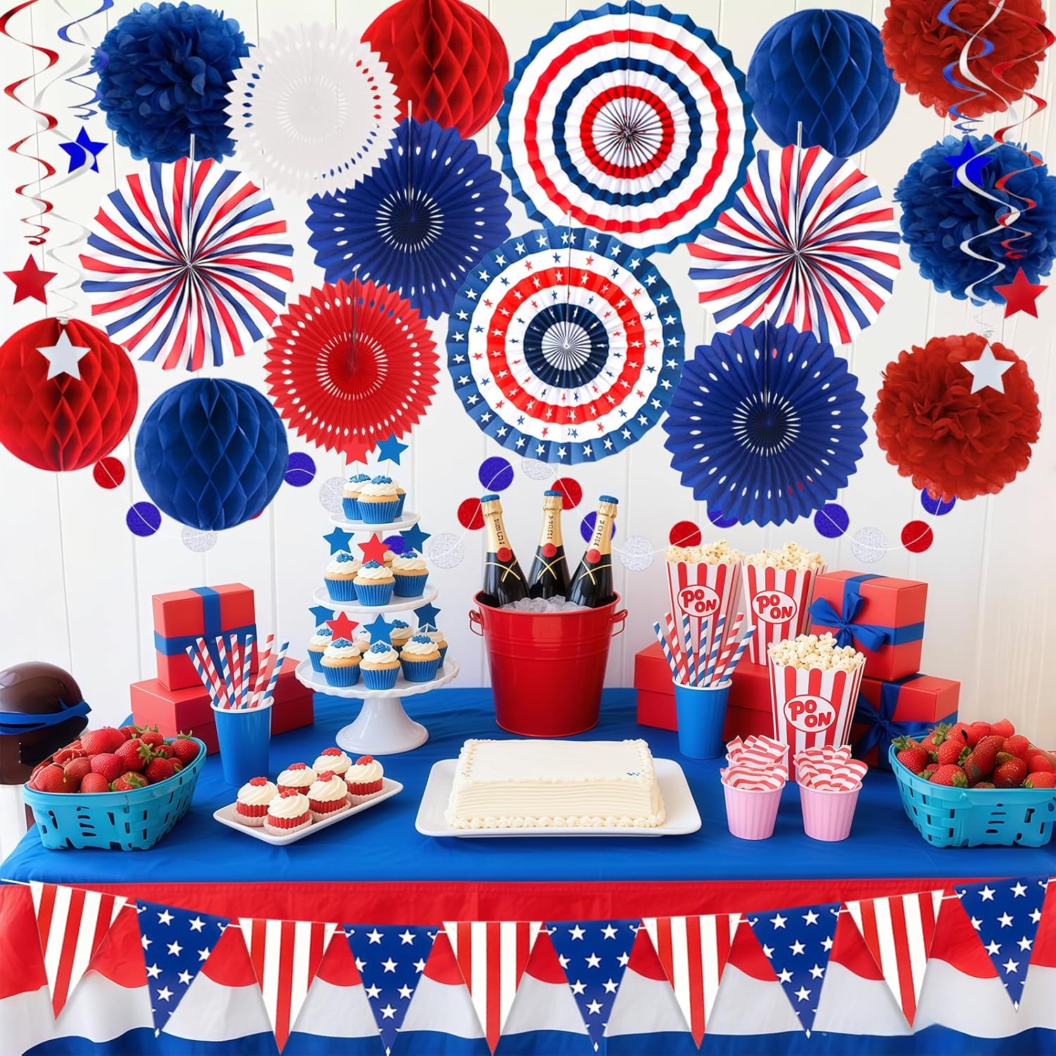 - [Package contains]: Red white and blue party decorations with 8PCS patriotic hanging paper fans in diffrent size, 1PCS 8.2ft triangle flag banner, 2PCS red + 2PCS blue + 2PCS white hanging swirls star, 4PCS 8in honeycomb balls, 4PCS 8in paper pom poms flowers, 1PCS 6.5ft circle banner. The color combination is very unique.