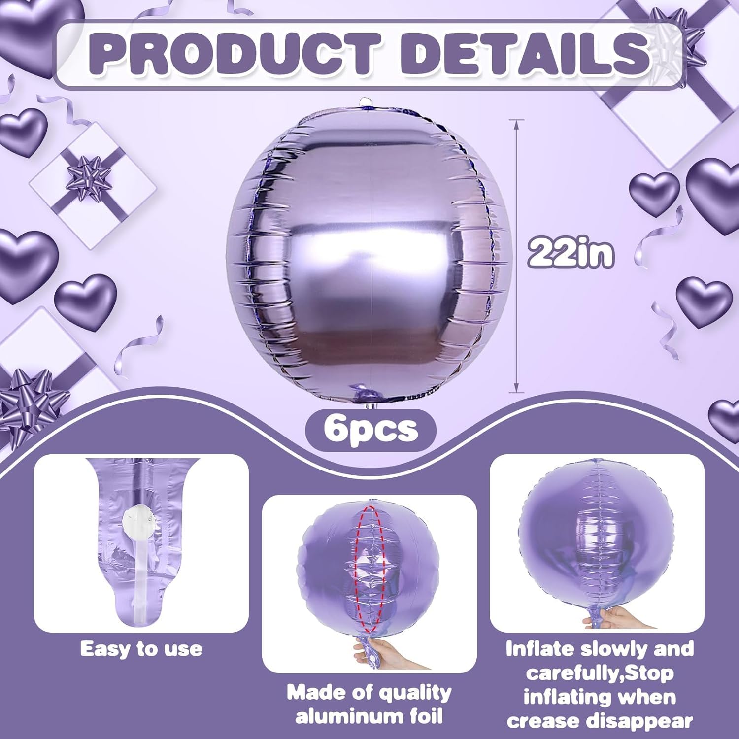 - 【6PCS ROUND BALLOONS】package include 6pcs 22inch Purple round giant 4D foil balloons. The Purple round balloons are large enough to help you better decorate your party.