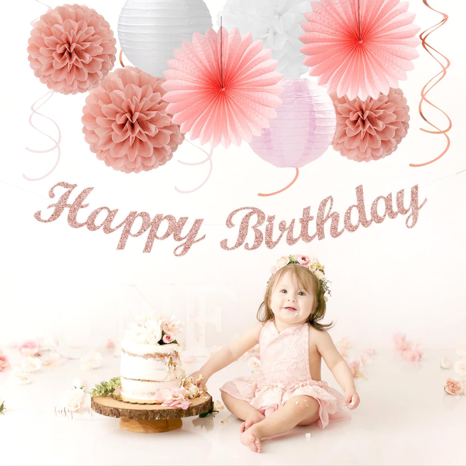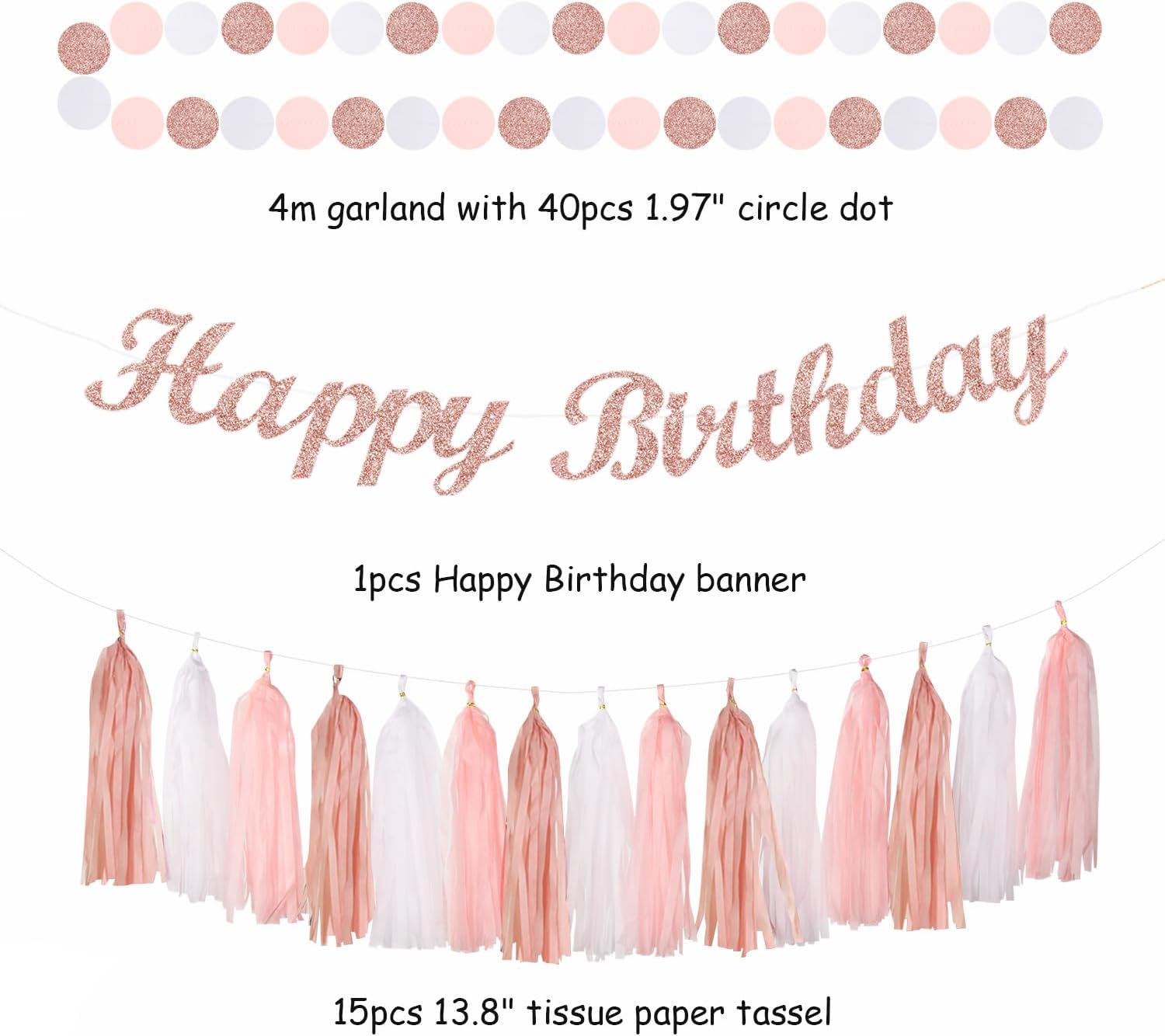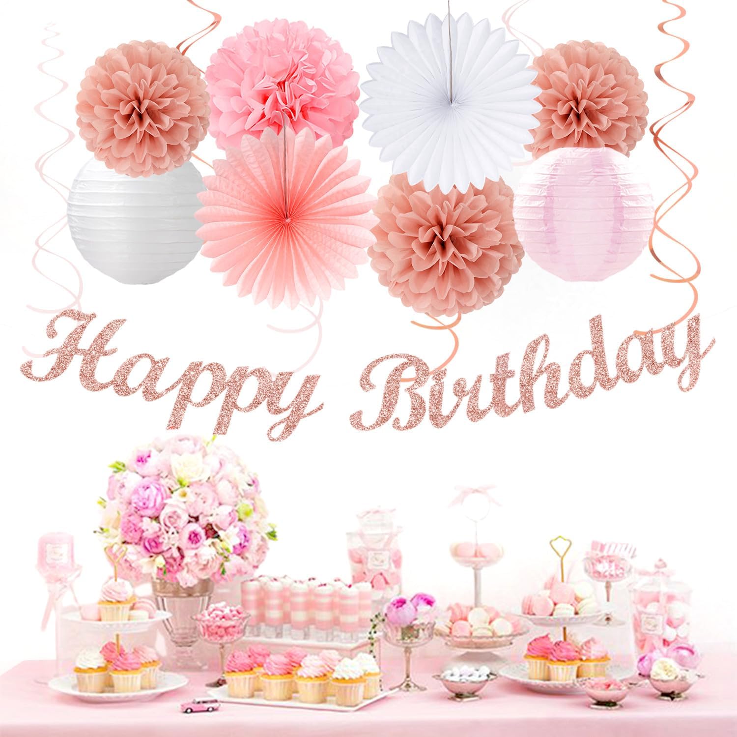 - Package Includes: This kits include 1pcs rose gold happy birthday banner, 1pcs circle dots paper banner, paper tassels party garland, 4pcs tissue pom poms, 2pcs paper lanterns, 2pcs paper flower fans, 6pcs paper swirls hanging streamers in rose gold pink and white colors, and different sizes