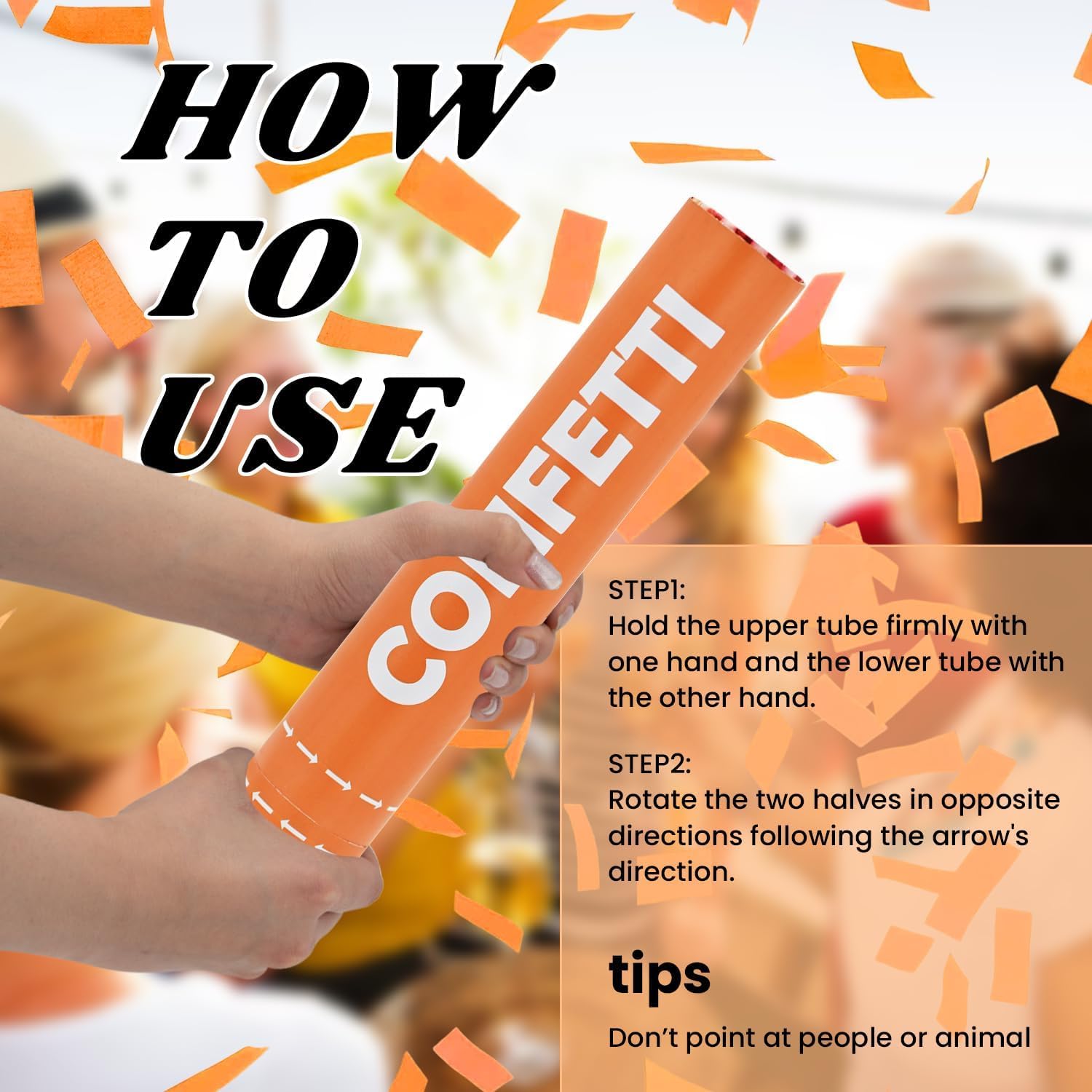 - 【Safe & Easy to Use】Our Orange biodegradablel confetti cannon kit contains Orange paper confetti are friendly, non-toxic. Biodegradable party poppers confetti shooters work well indoors and outdoors easy to clean and 100% safety, you and your guests can enjoy confetti cannon for your celebrations party.Just give each confetti cannon a hard twist and let the magic happen!