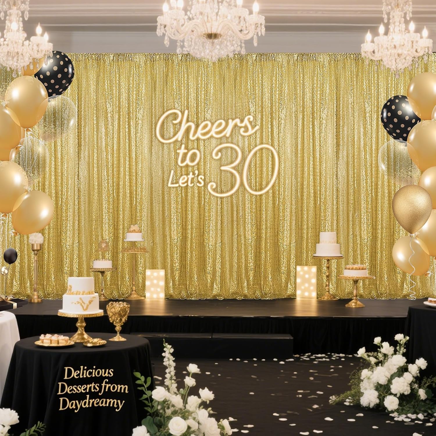 - Sparkly Backdrop: Seamless sequins make the backdrop curtain offering a sparkle effect in the light. Creating a luxurious atmosphere for your events.